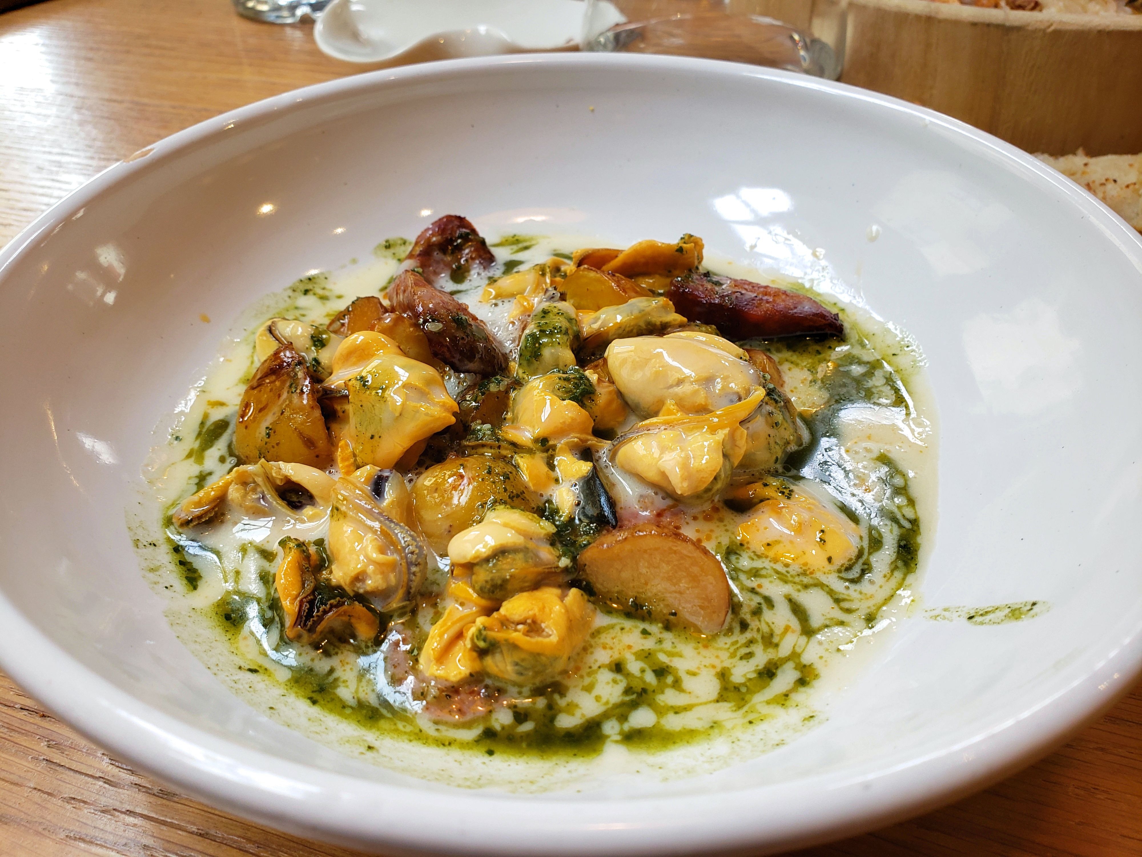 - Des moules décortiquées, chorizo frais de Belaun, pommes de terre et pesto basilic