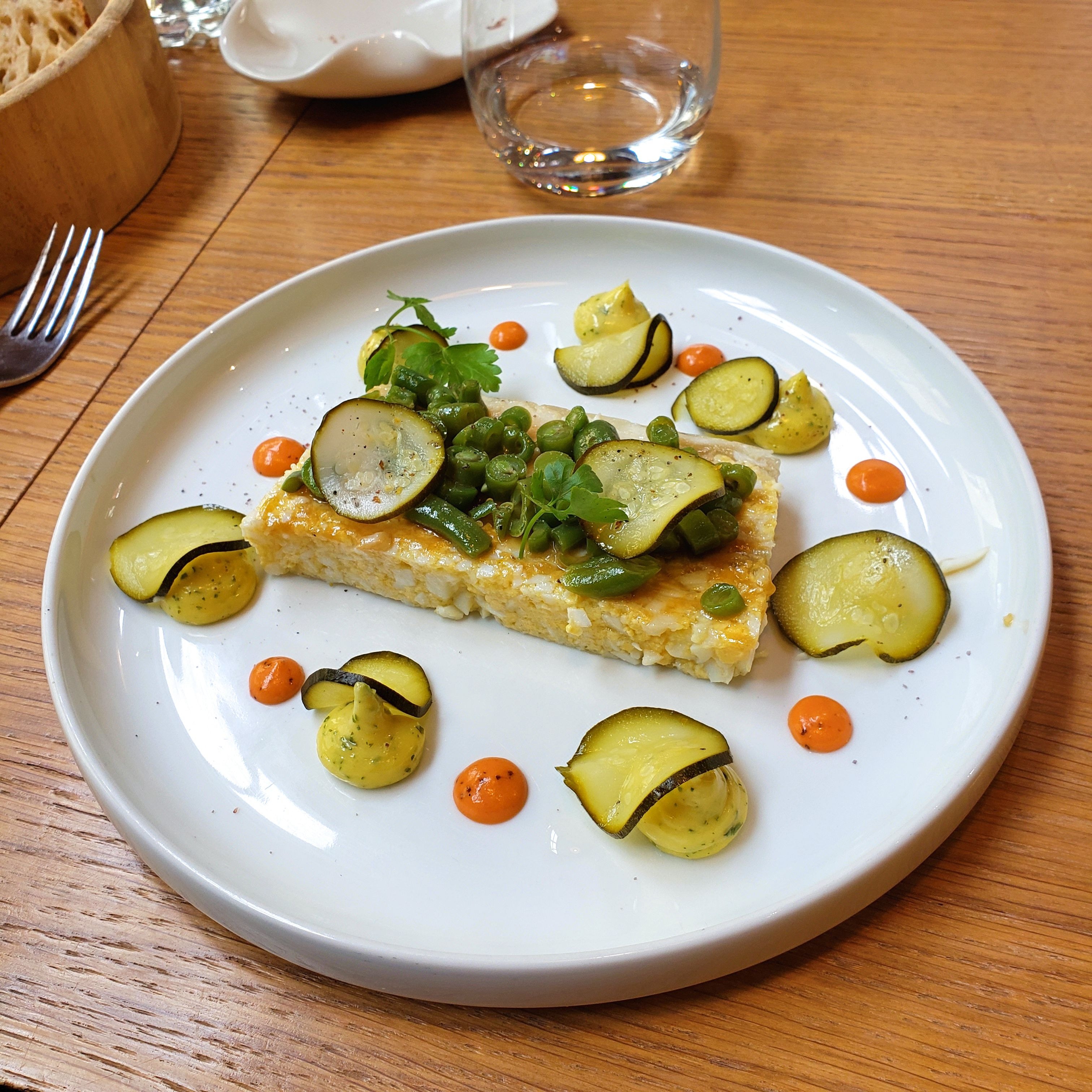 - Pressé de lieu et oeufs durs, pickles de courgettes, mayonnaise d’herbes et haricots verts