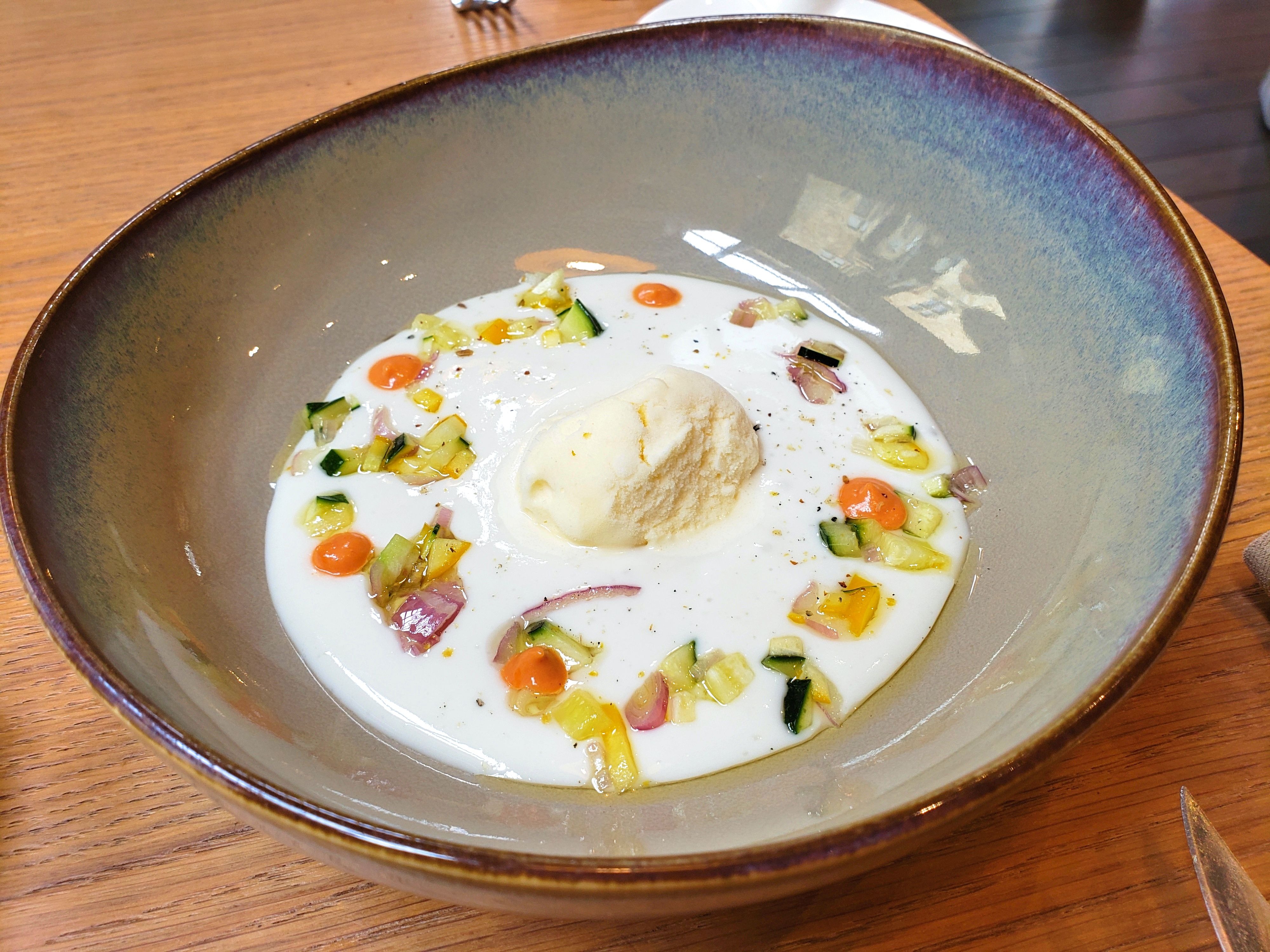 - Crème froide de riz, glace à l’ail des ours et échalotes