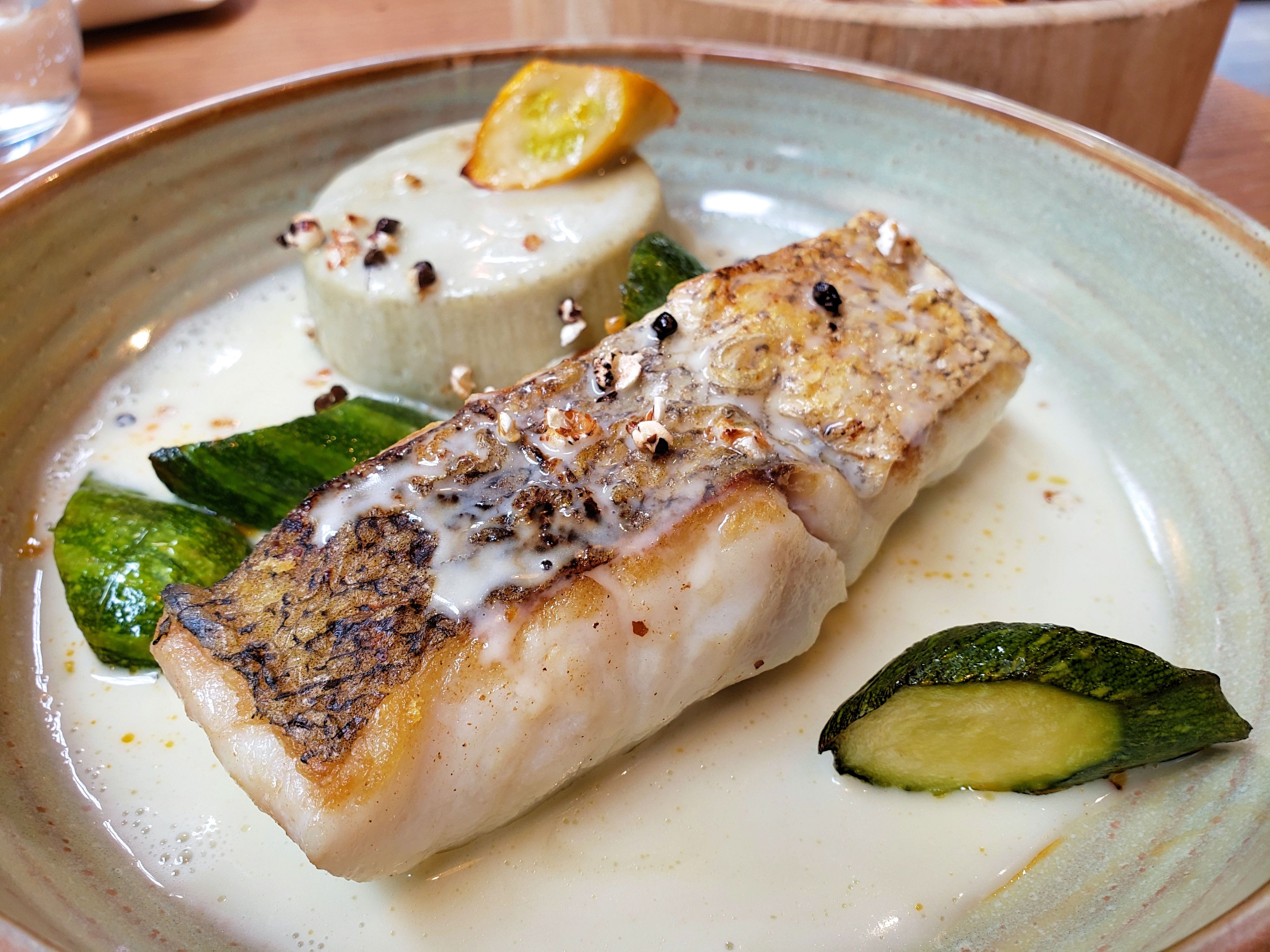 - Merlu grillé, flan d’aubergines, émulsion citron confit