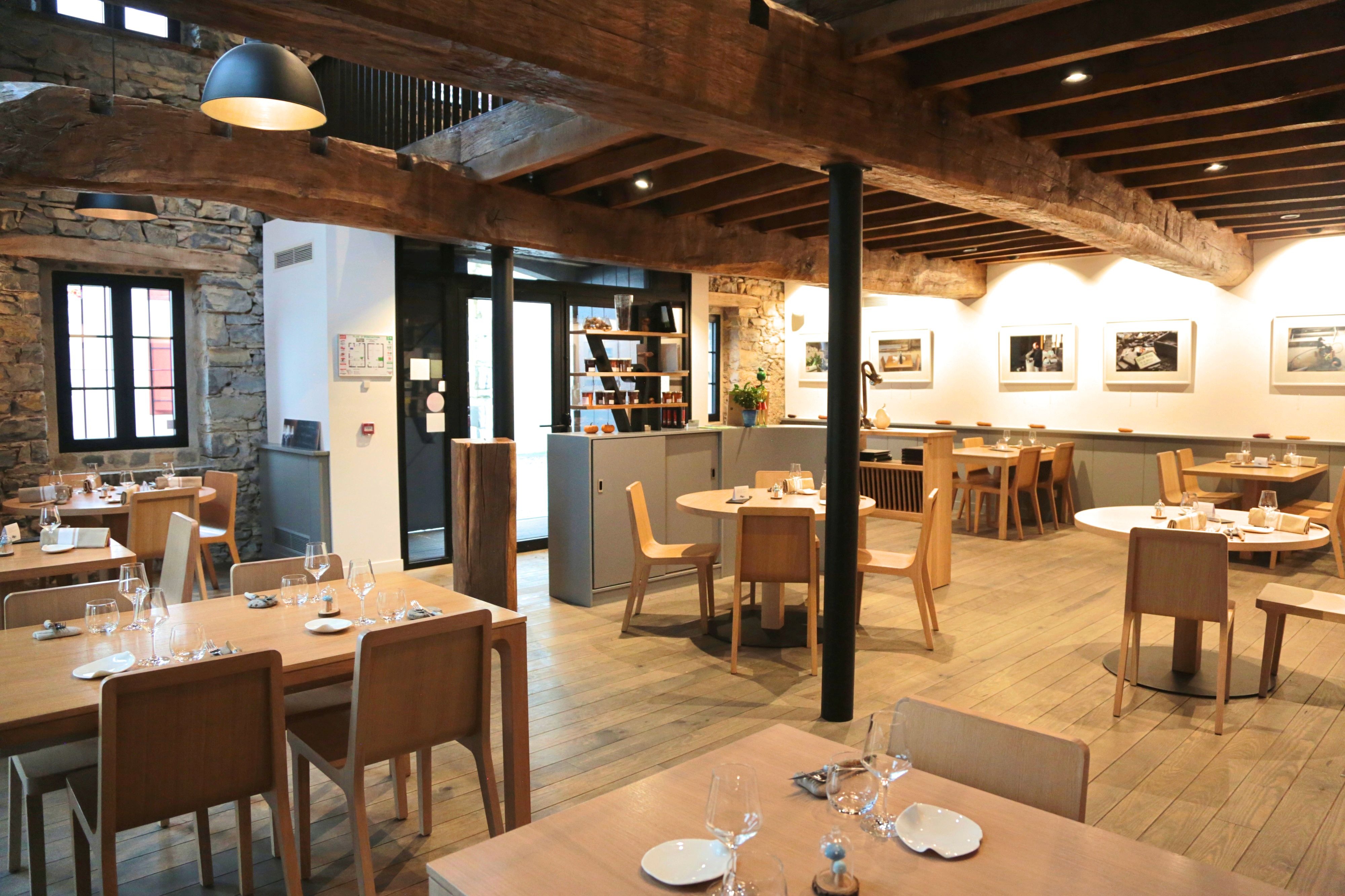 Idem côté décor : l’imposante bâtisse en pierre (qui jouxte une superbe commanderie) est à la fois rustique et moderne. Pierres apparentes et magnifique charpente se mêlent au mobilier contemporain. Les couverts Opinel et linges de table basques côtoient une vaisselle design aux lignes épurées. Et tout est harmonieux et de bon goût.