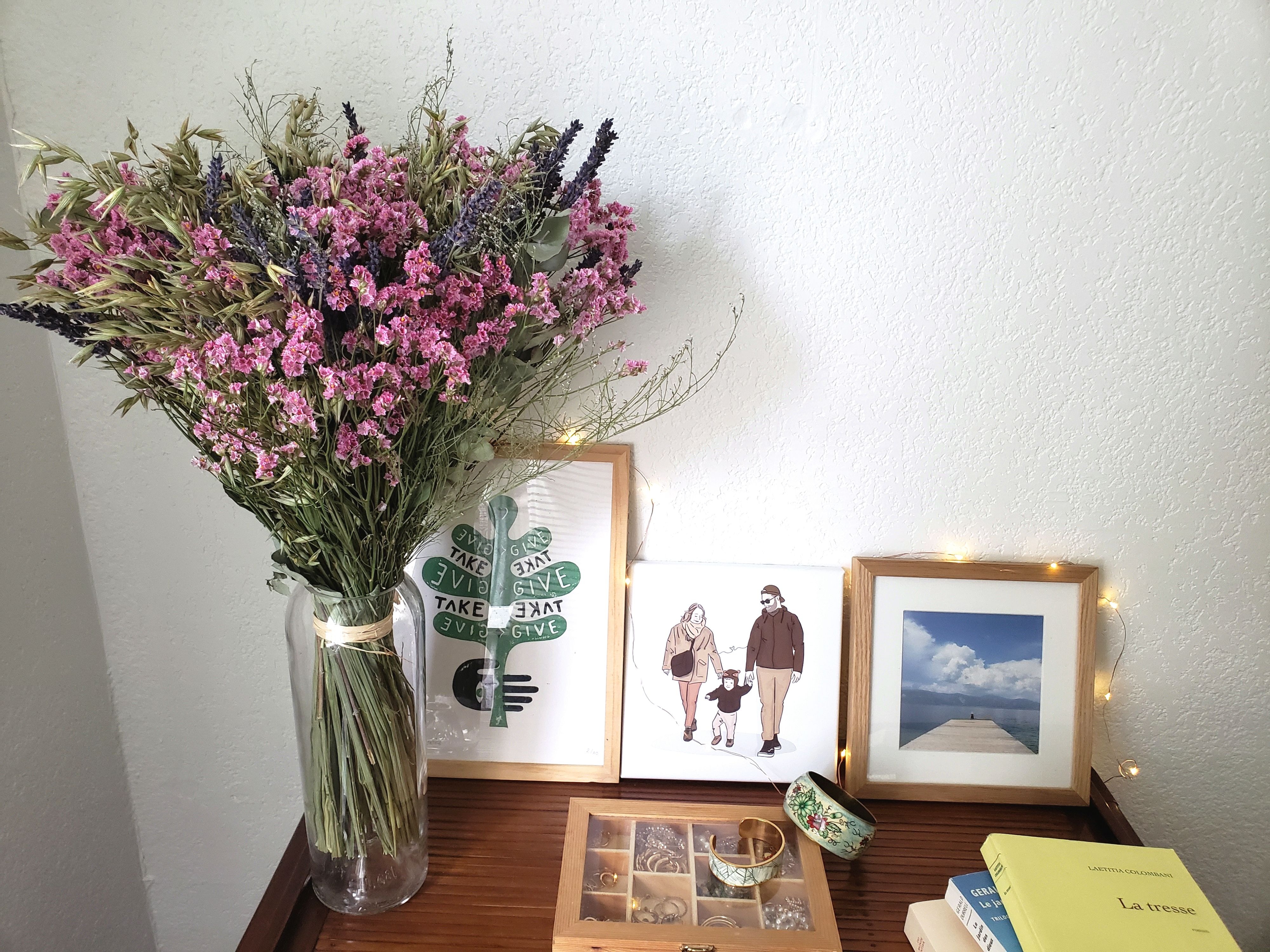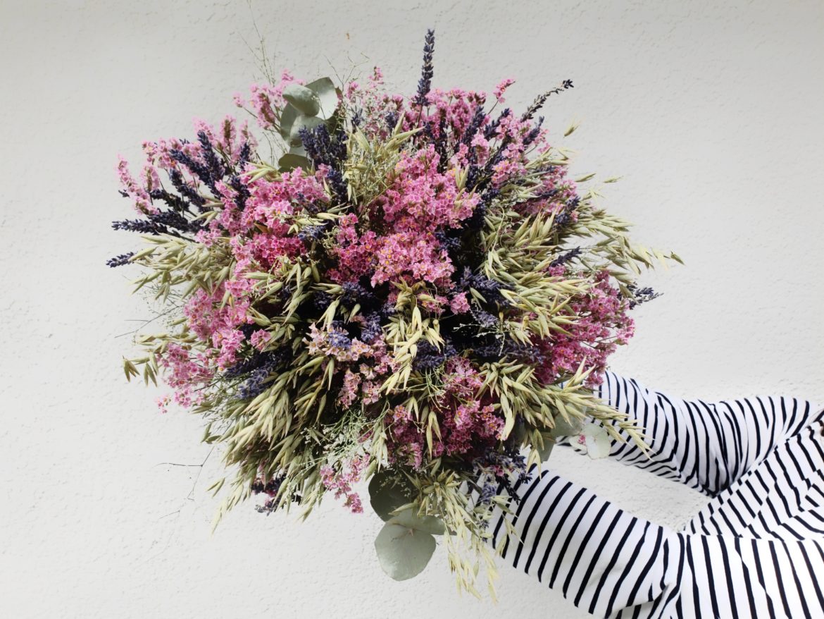 Pour le bouquet de fleurs séchées j’ai complètement craqué pour le bouquet Lubéron à 59,90 €. Dégradés de violets et verts avec de l’avoine, de la lavande (je vous laisse imaginer le délicieux parfum lorsque j’ai ouvert mon colis), du limonium et de l’eucalyptus.