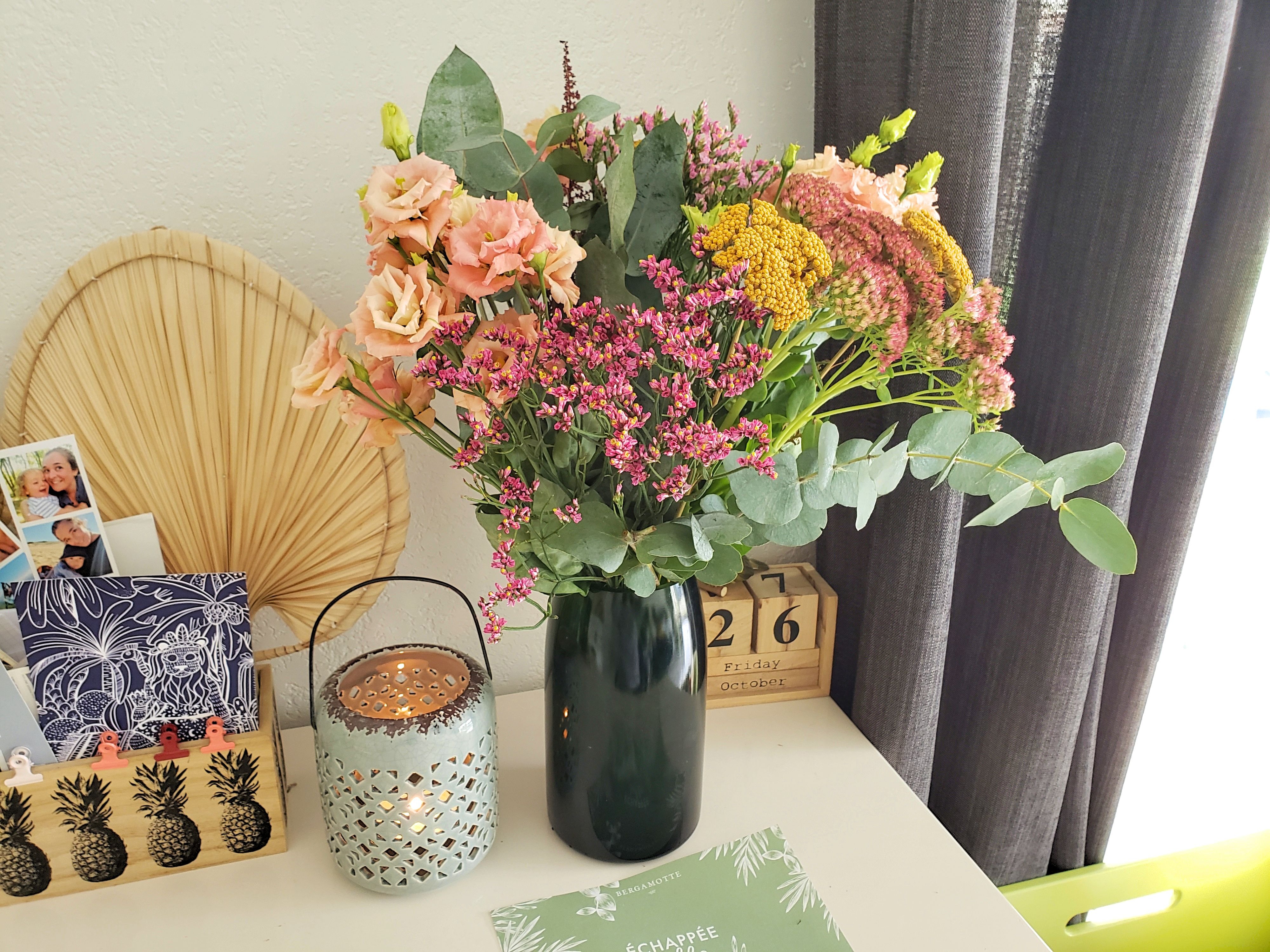 Pour les fleurs fraîches j’ai choisi une composition dans les déclinaisons de roses et violets avec des touches de jaunes : le bouquet Alberta au prix de 39,90 €. J’adore le mélange de Lisianthus abricot et d’Achillées (ces fleurs jaunes rendent très bien version séchées aussi).