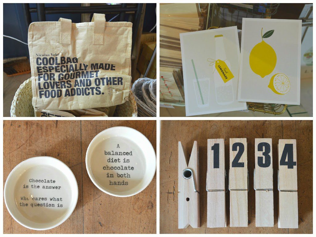 Sac-glacière 5 € (Nicolas Vahé) / Cartes postales 2€ l’une (Michoucas Design) / Coupelles 7.5 € l’une (Bloomingville) / Grandes pinces 3€ l’une (House Doctor)