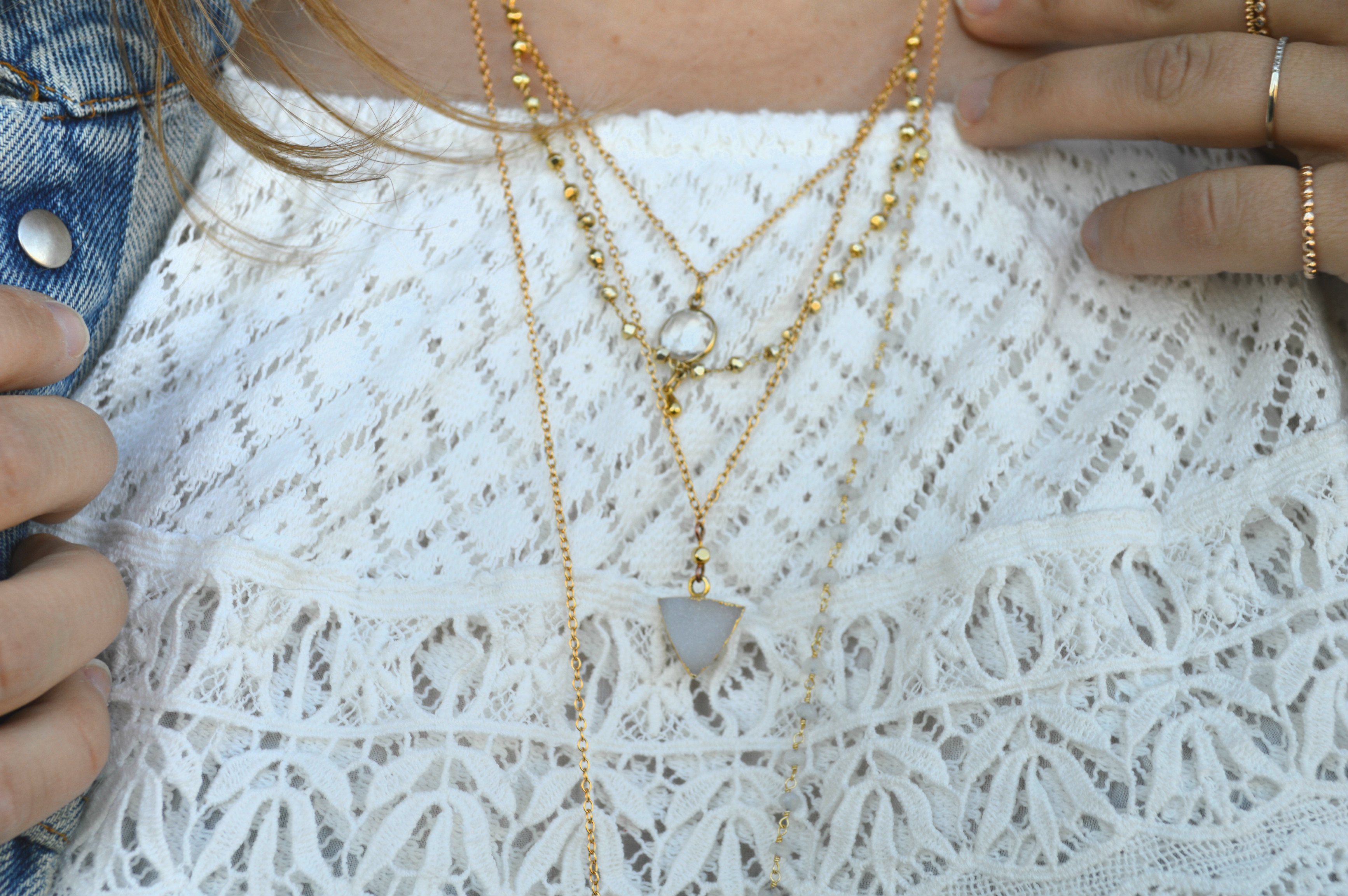 Je mixe ce sautoir avec le collier Lia trois chaînes dans les mêmes tons or et blanc.
