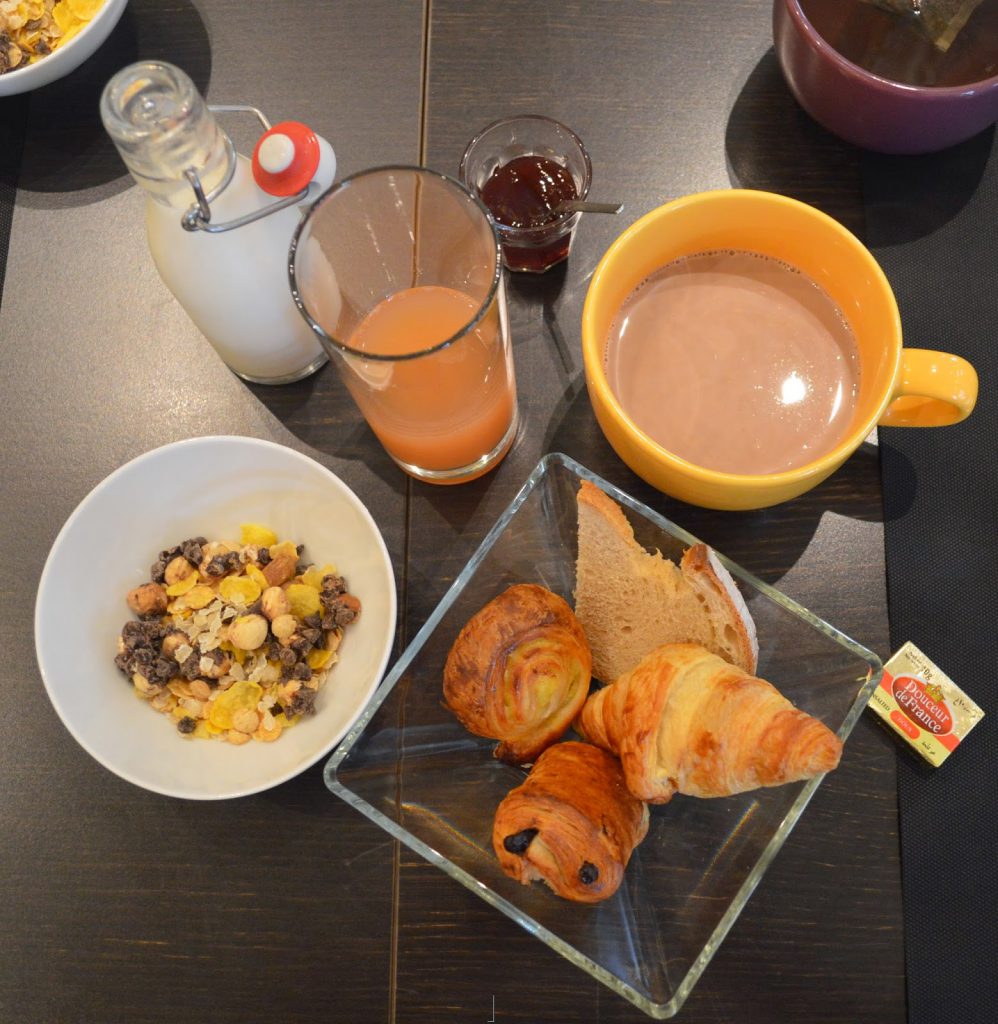 Au programme : mini viennoiseries, pain frais, jus de fruits variés, muesli maison, confitures, miel, beurre, yaourts et boissons chaudes (thé, lait, café). Bref le petit dej complet comme j’aime!