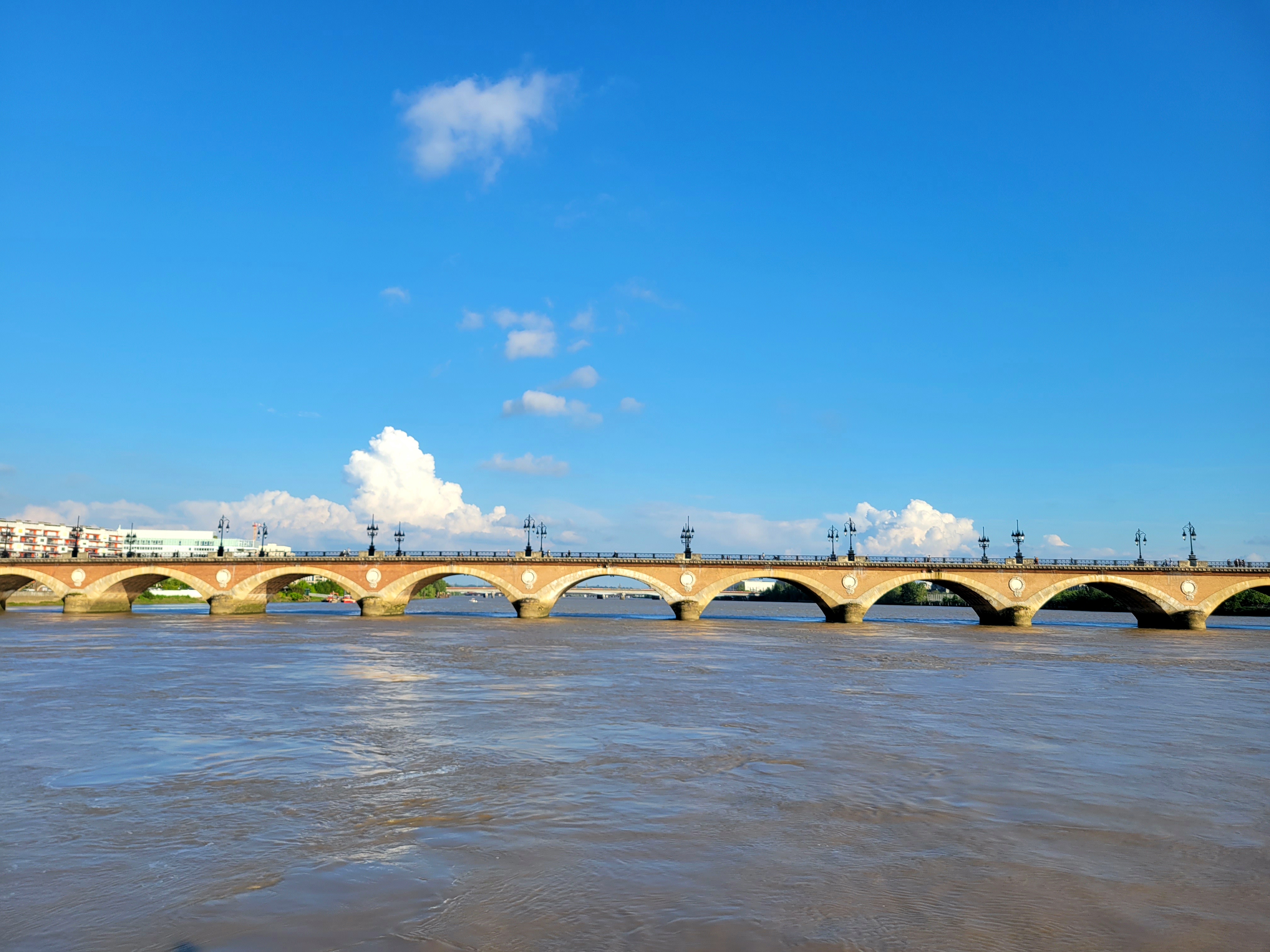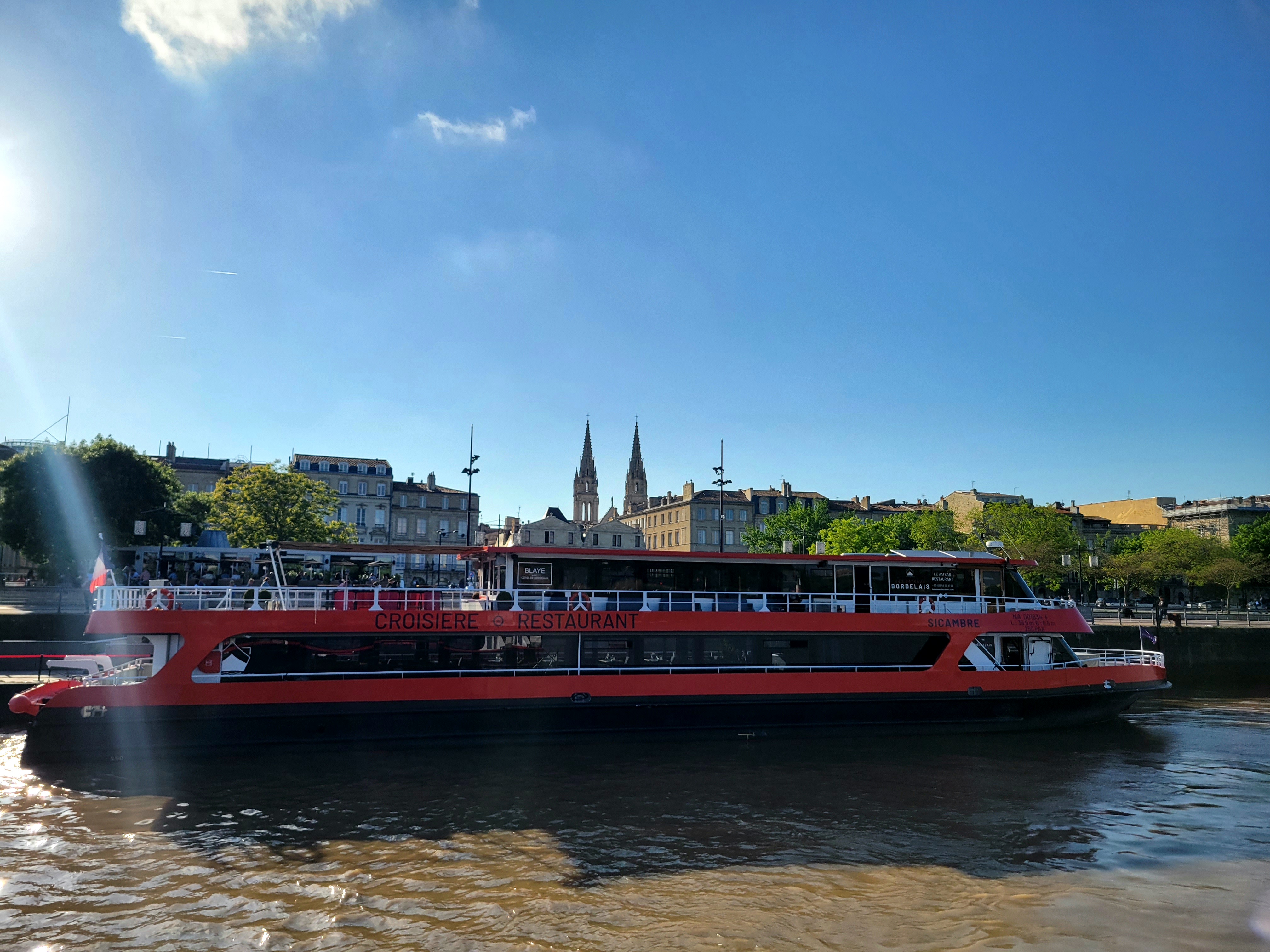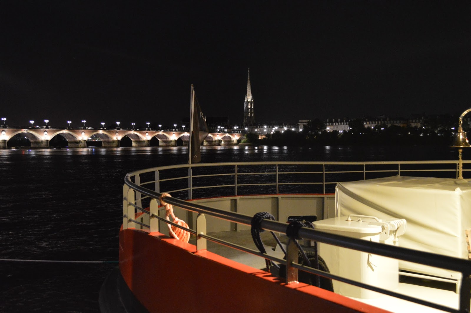 19h : on quitte doucement Bordeaux et notre superbe ville défile sous nos yeux : les quais, les Quinconces, le Miroir d’eau. Les flèches et clochers pointent derrière les grandes façades de pierre : la tour Pey Berland, la Cathédrale Saint-André, la porte Cailhau, la Grosse Cloche… On s’approche du Pont de Pierre, puis on s’éloigne de Saint-Michel direction le pont Chaban Delmas et la Cité du Vin.