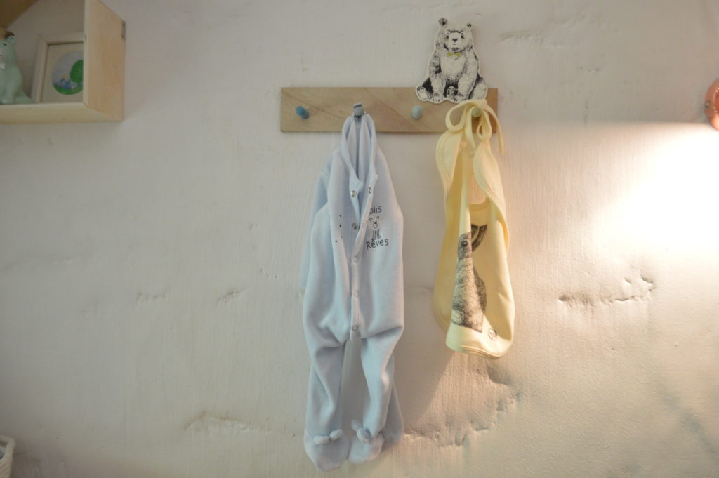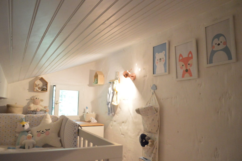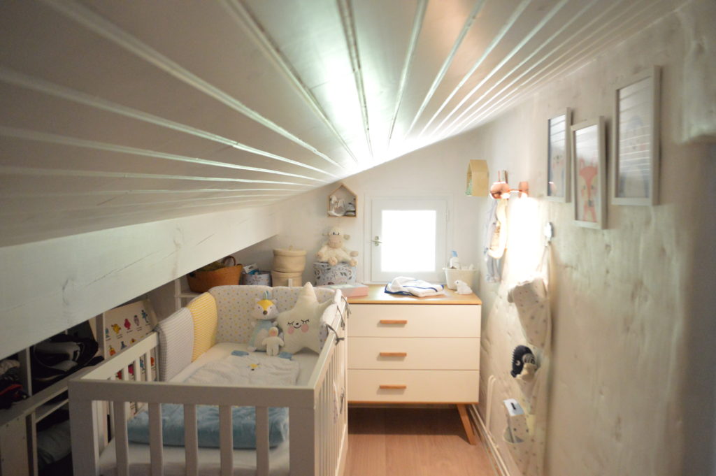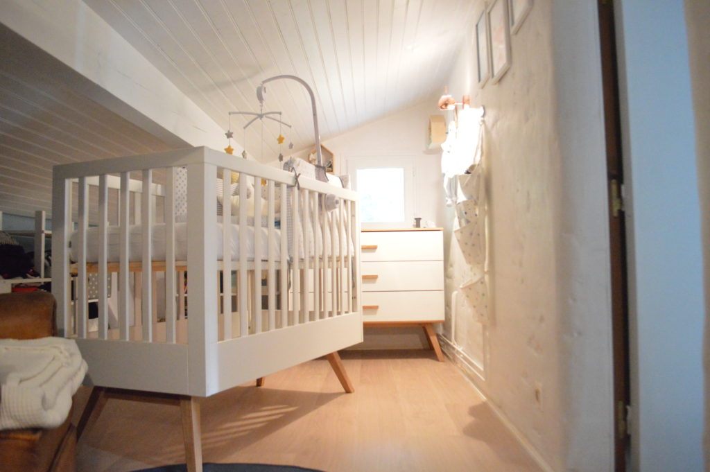 Pour être au mieux nous avons décidé de réaménager l’étage et de transformer les deux chambres existantes. La chambre de ma sœur benjamine est devenue la nôtre après une pose de parquet et un changement de mobilier. Et la chambre de ma sœur aînée, sous les combles, a été transformée en chambre de bébé.