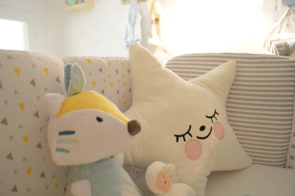 Donc, c’est à partir de ce mobilier blanc/bois que nous avons intégré des éléments de couleur. Nous sommes partis sur des touches de jaune, gris et bleu, des couleurs pastels et des motifs nature (animaux, étoiles, fleurs).