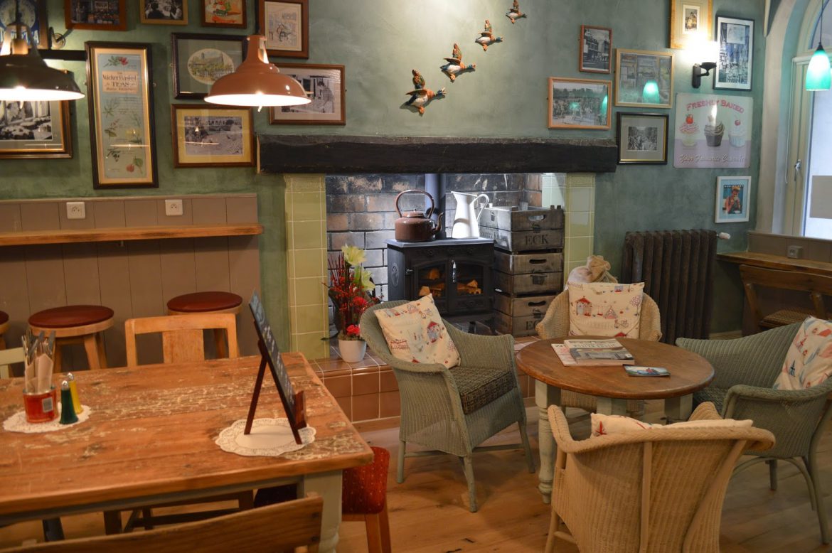 Tout est bien choisi, dans la tendance du moment : bois brut, déco vintage, lampes au design industriel et partout des petits détails sympa et fun comme ces tasses à café en liberty utilisées en appliques et qui viennent éclairer la caisse !