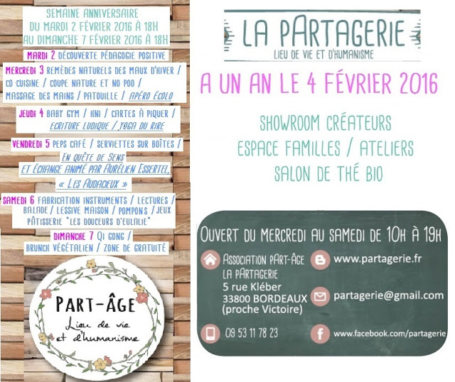 L’assocation Part-Âge souffle sa première bougie : une année d’ateliers, de créations, d’artisanat et d’échanges. La pArtagerie comprend un salon de thé, un coin d’éveil et de jeux, un showroom créateur, une bibliothèque et un espace dédié aux ateliers. Et au programme de cet anniversaire : des ateliers, un apéro-écolo organisé par la marraine de l’asso, Camille Ecologirl, projection de film et brunch végétalien participatif.
