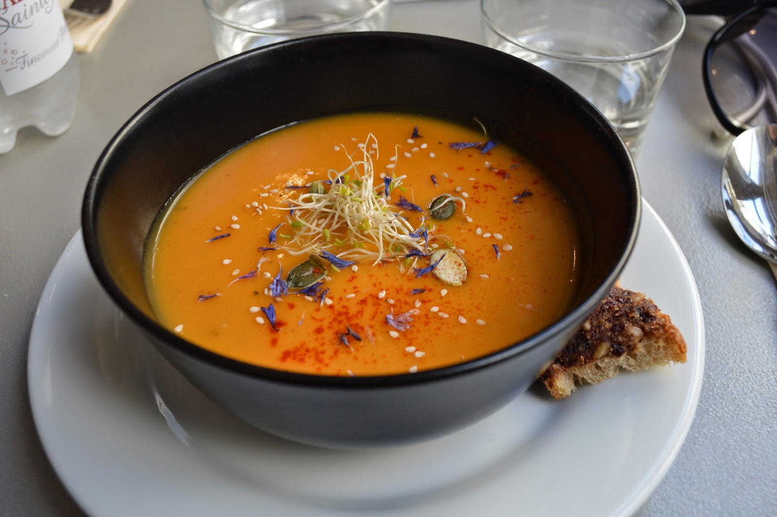 Chaque plat est très joliment présenté avec un souci du détails digne d’un grand restaurant et avec des petites surprises sympas comme, pour mon entrée, ces deux petites tartines de crumble aux fruits rouges qui se mariaient parfaitement avec la douceur du velouté !
