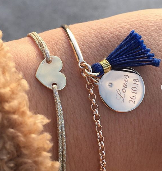 Le deuxième est un bracelet personnalisable de la marque l’Atelier d’Amaya, mi chaîne mi jonc, avec médaille à graver et petit pompon de couleur.