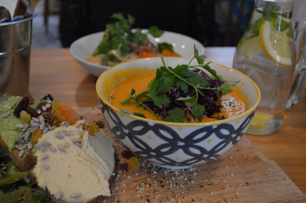J’ai adoré la “tartine big soup” à 11,90€ : grand bol de velouté chaud de légumes et céréale accompagné d’une tartine de pain complet bio avec d’une part un houmous maison et d’autre part un écrasé d’avocat. Le tout agrémenté d’une belle salade mesclun et de graines, pétales de betteraves et de carottes.