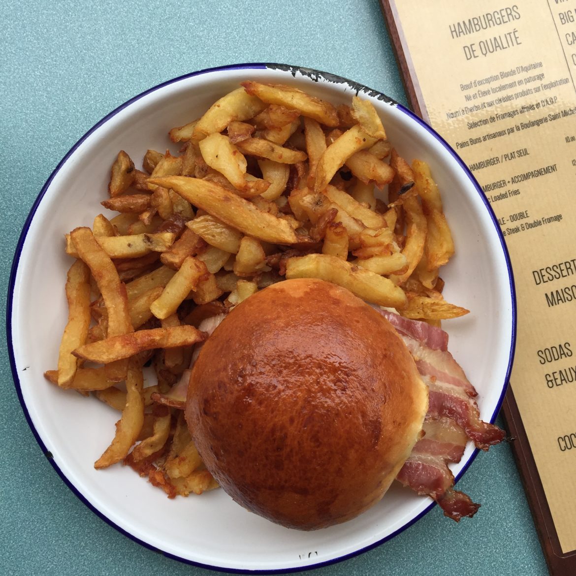 Maintenant regardons de plus près la carte : un joli choix de burgers tout frais à 10 € (OMG mais lequel choisir?) ou à 12€ en formule. Le pain artisanal vient de La Boulangerie (place Saint Michel, une référence), les fromages sont AOP, le boeuf Blonde d’Aquitaine… autant vous dire qu’avec tous ces ingrédients de qualité, les burgers sont déments !