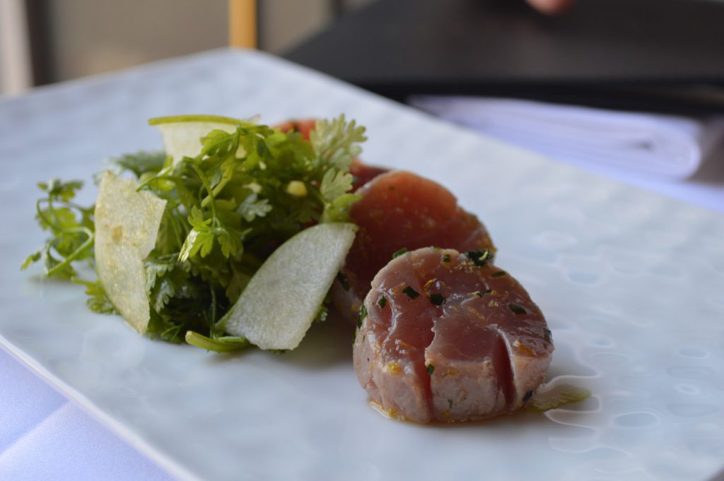 En entrée, difficile de choisir entre le foie gras mi-cuit, fruits rouges, fleur de sureau et brioche toastée (assiette aussi belle que délicieuse – 21€) et le thon snacké, avocat, salade d’herbes au citron vert et pomme Granny Smith (19€).