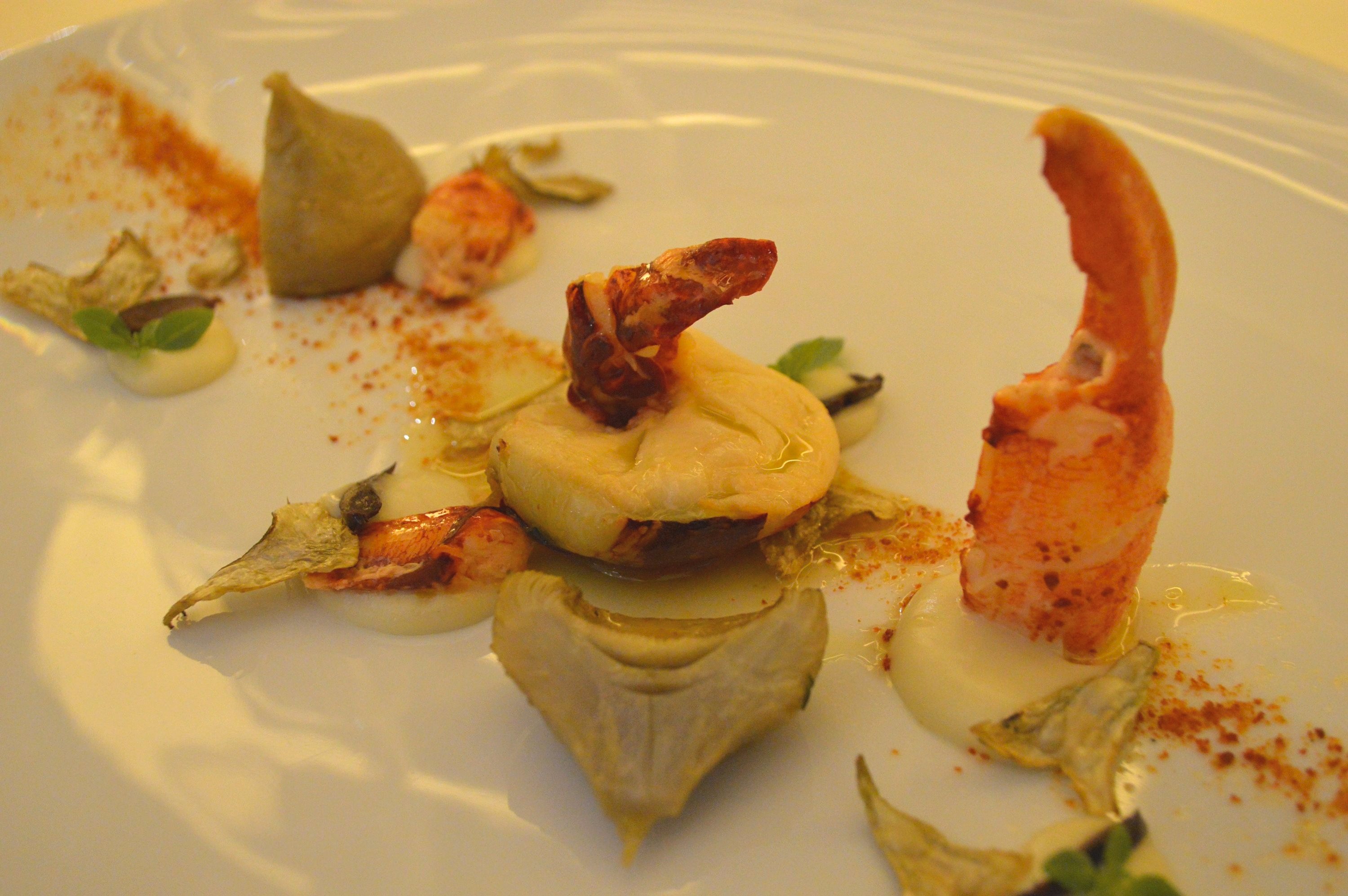On poursuit avec le premier plat : Le homard cuit à l’étouffée dans l’argile, bois d’olivier, olive noire Kalamata et artichauts poivrade. Accompagné d’un Pernand Vergelesses Blanc 2014, Vincent Girardin