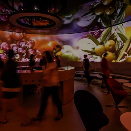 Cet atelier d’1h30 se déroule dans une salle ronde avec écran à 360°. Installés sur de confortables canapés, nous sommes invités à déguster 5 vins différents tout en nous laissant bercer par sons, images et odeurs diffusés dans la pièce.