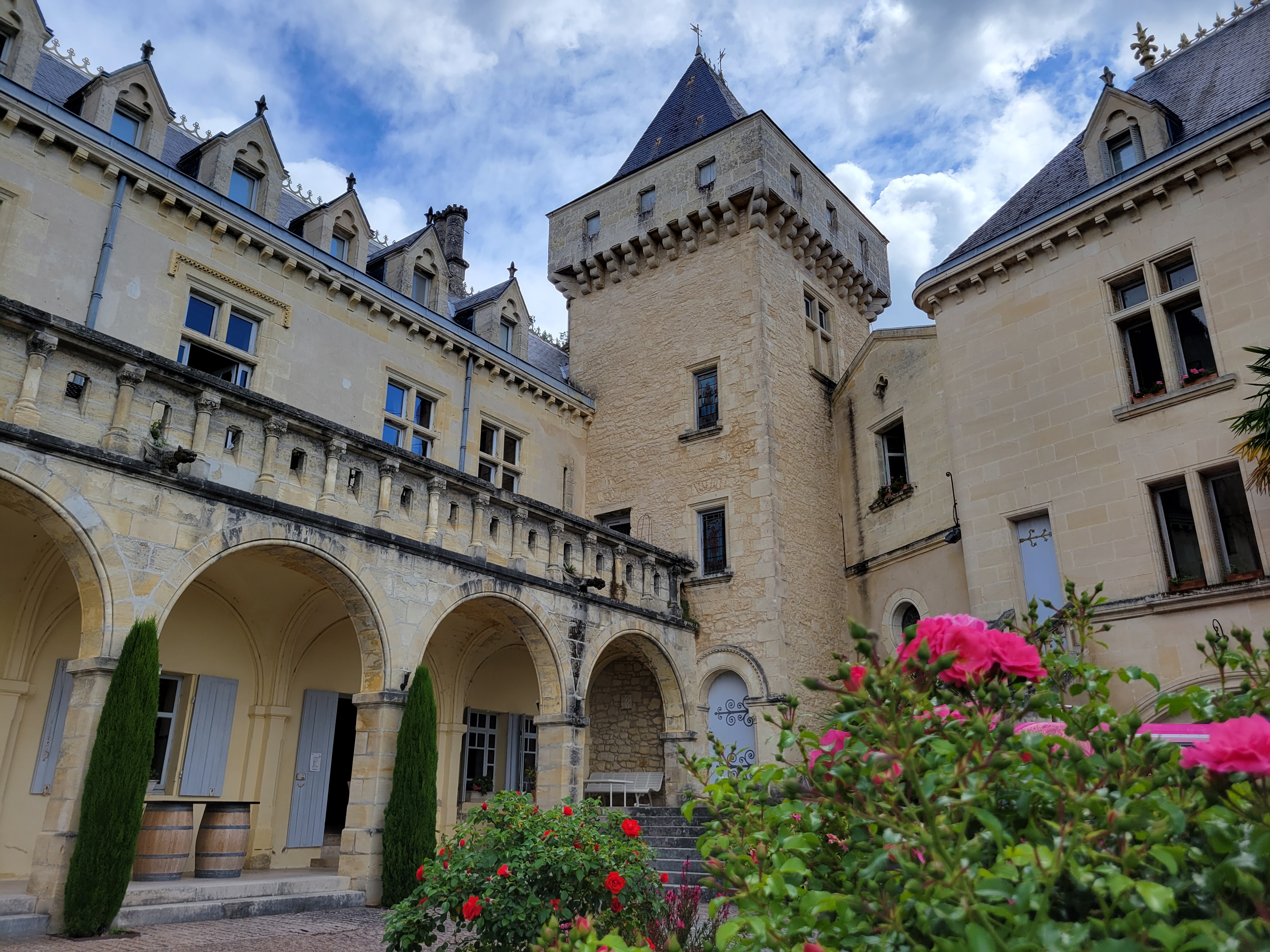 Déjà le chemin pour accéder au château plante le décor : plus de 2 km à travers collines et forêt pour arriver devant une bâtisse superbe, construite au XVI° puis rénovée aux XVIII° et XIX° siècles. Des gargouilles inspirée de Notre-Dame-de Paris (l’architecte était un des disciples de Viollet-le-Duc), un balcon très Roméo et Juliet, une cour qui donne sur les dizaines d’hectares de vignes de la propriété et une superbe piscine en contrebas. Un vrai décor de cinéma !