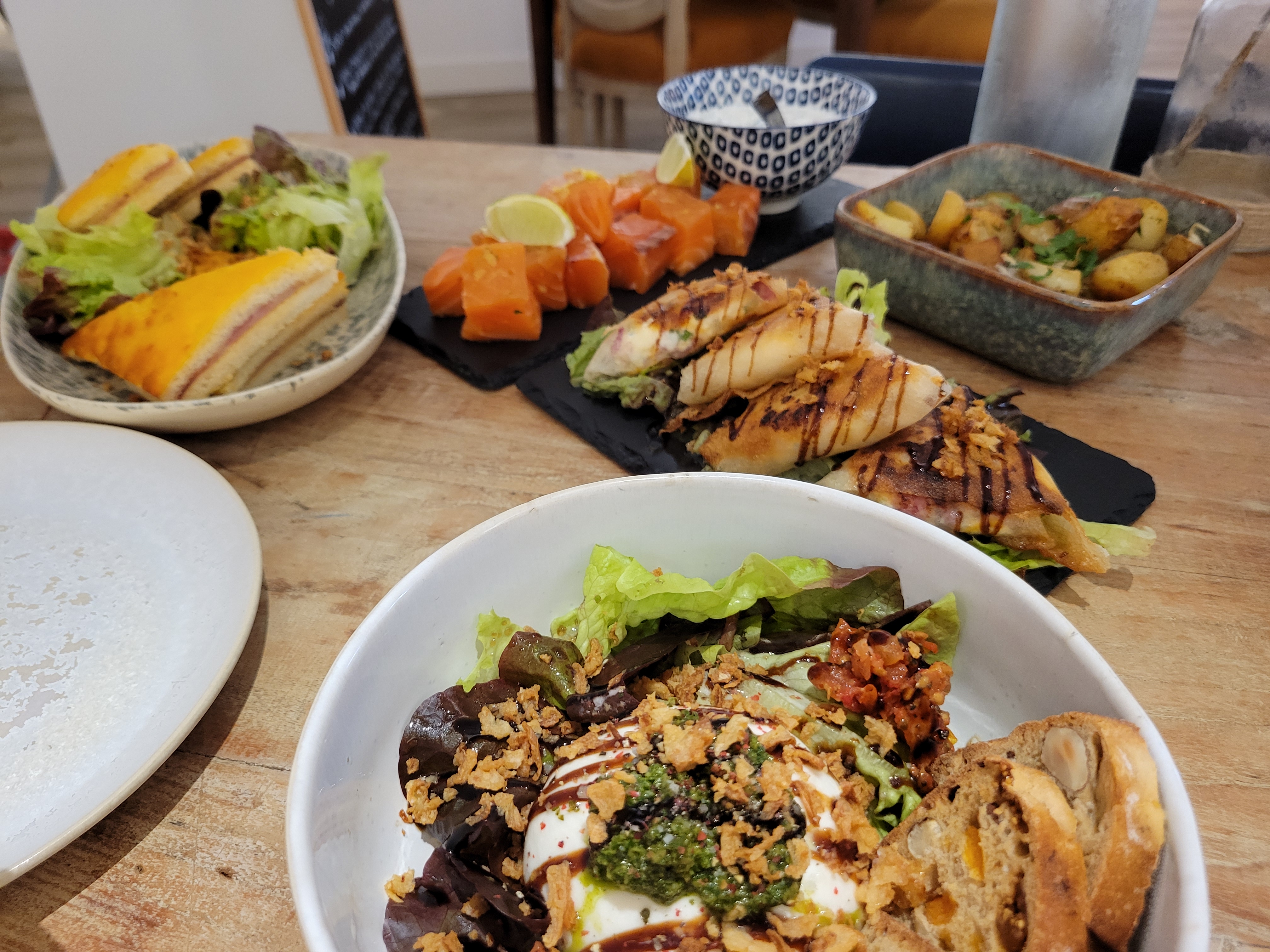 A la carte : des cocktails, des vins et des assiettes à partager. Tout maison, tout frais, en toute simplicité. On a adoré les pommes de terre grenaille, le croque, le gravlax de saumon (hyyyper généreux) mais aussi les samossas et la burrata. Gardez de la place pour le dessert car la Galerie des Quais possède aussi une pâtisserie “La fabrique à desserts” et propose donc ses gâteaux au restaurant. De vrais bons desserts de pâtissiers !