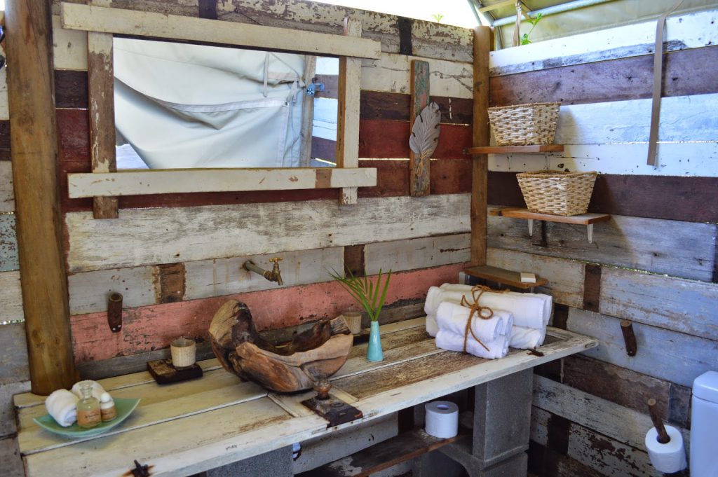 L’intérieur des tentes est fait de matériaux de récupération : des palettes pour le sommier du lit, des caisses ayant servies au transport de légumes pour les étagères et de vieilles portes de bois en guise de meubles de salles de bain. Ecolo !