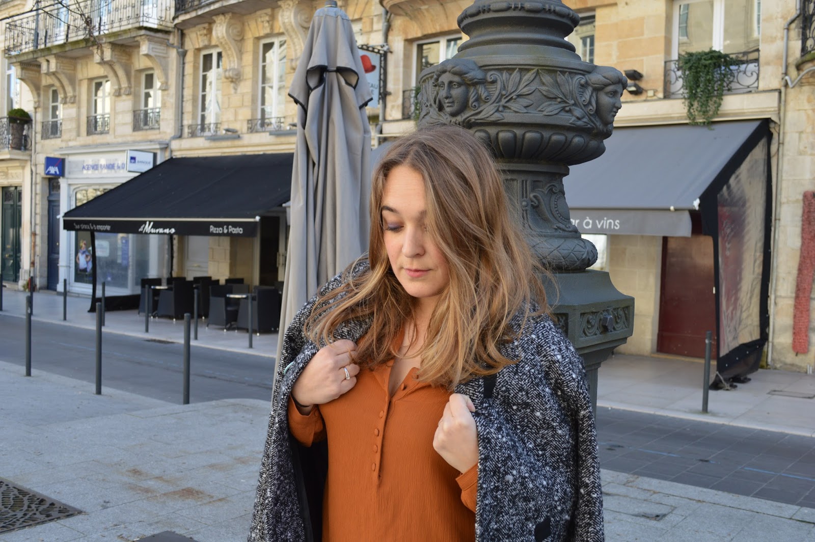 J’ai trouvé ce manteau de la marque ColorBlock chez Les Pipelettes, boutique bien connue à Talence et qui vient d’ailleurs d’ouvrir un deuxième du nom à Mérignac. Il se porte ouvert, parfait donc pour la mi-saison. J’adore les empiècements imitation cuir sur les poches et le col et je lui trouve un petit côté Isabel Marant, le prix exorbitant en moins !