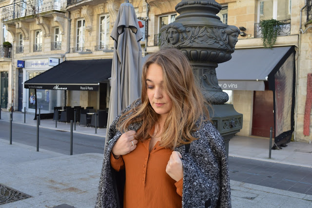 Nouvelle couleur dans mon dressing : l’ocre ! Cette blouse en crêpe de viscose est disponible en ce moment chez Mango à 29.99€ (et dans d’autres coloris). J’adore le boutonnage assez class et donc la couleur, très à la mode ce printemps-été. J’ai longuement hésité avec le modèle bleu marine mais j’avais envie de changer et avec mes jeans foncés cette couleur terre ressort plutôt bien.