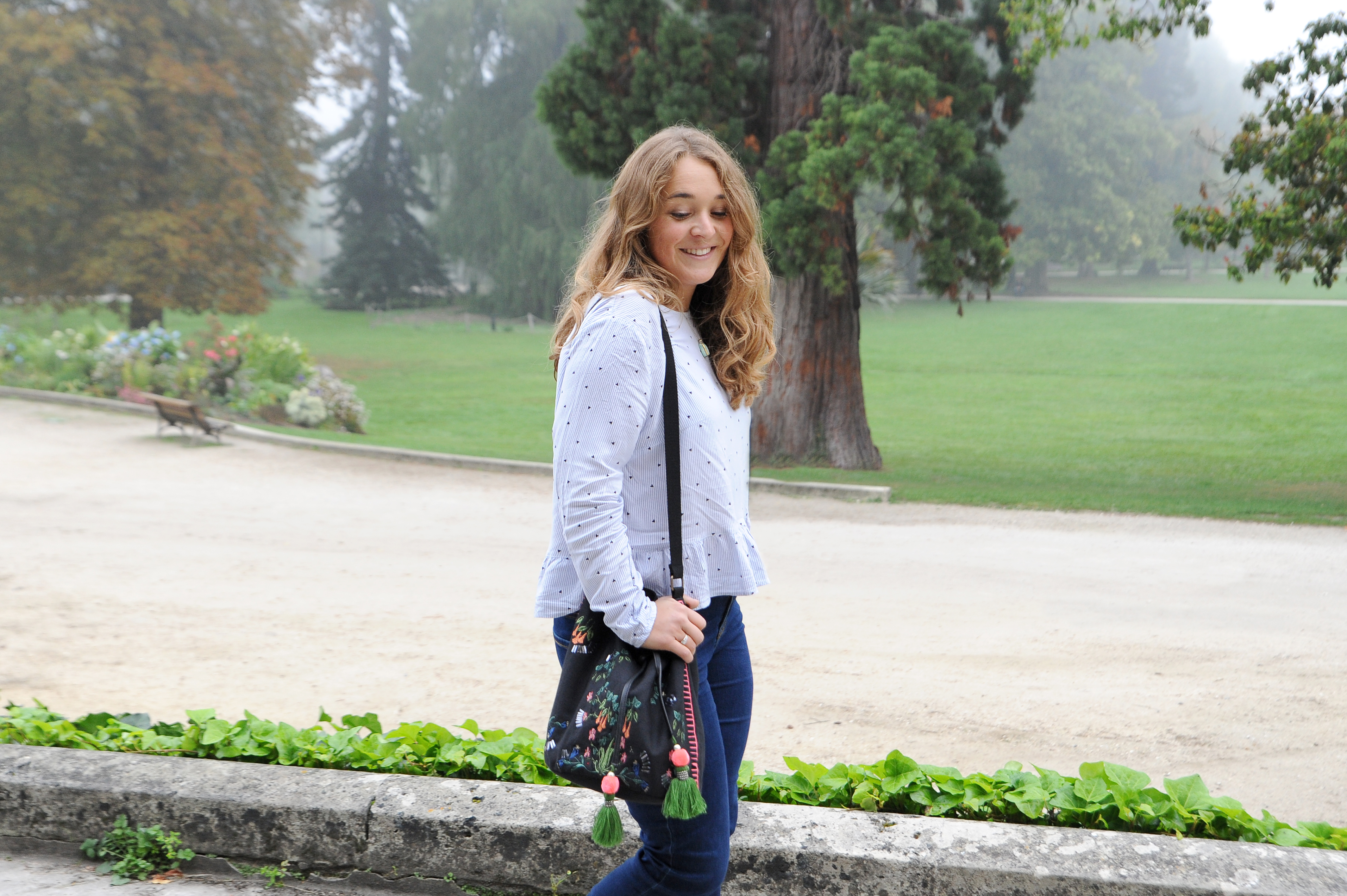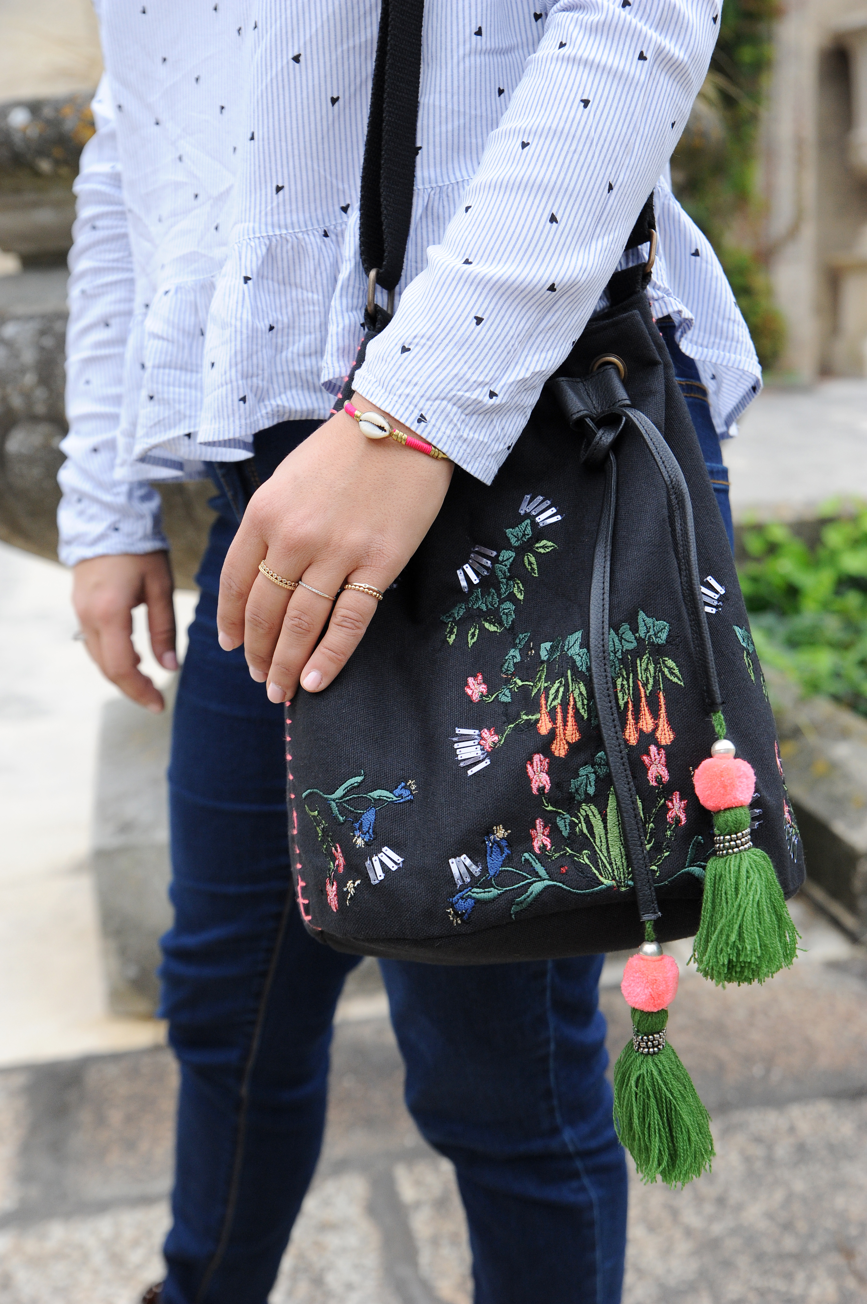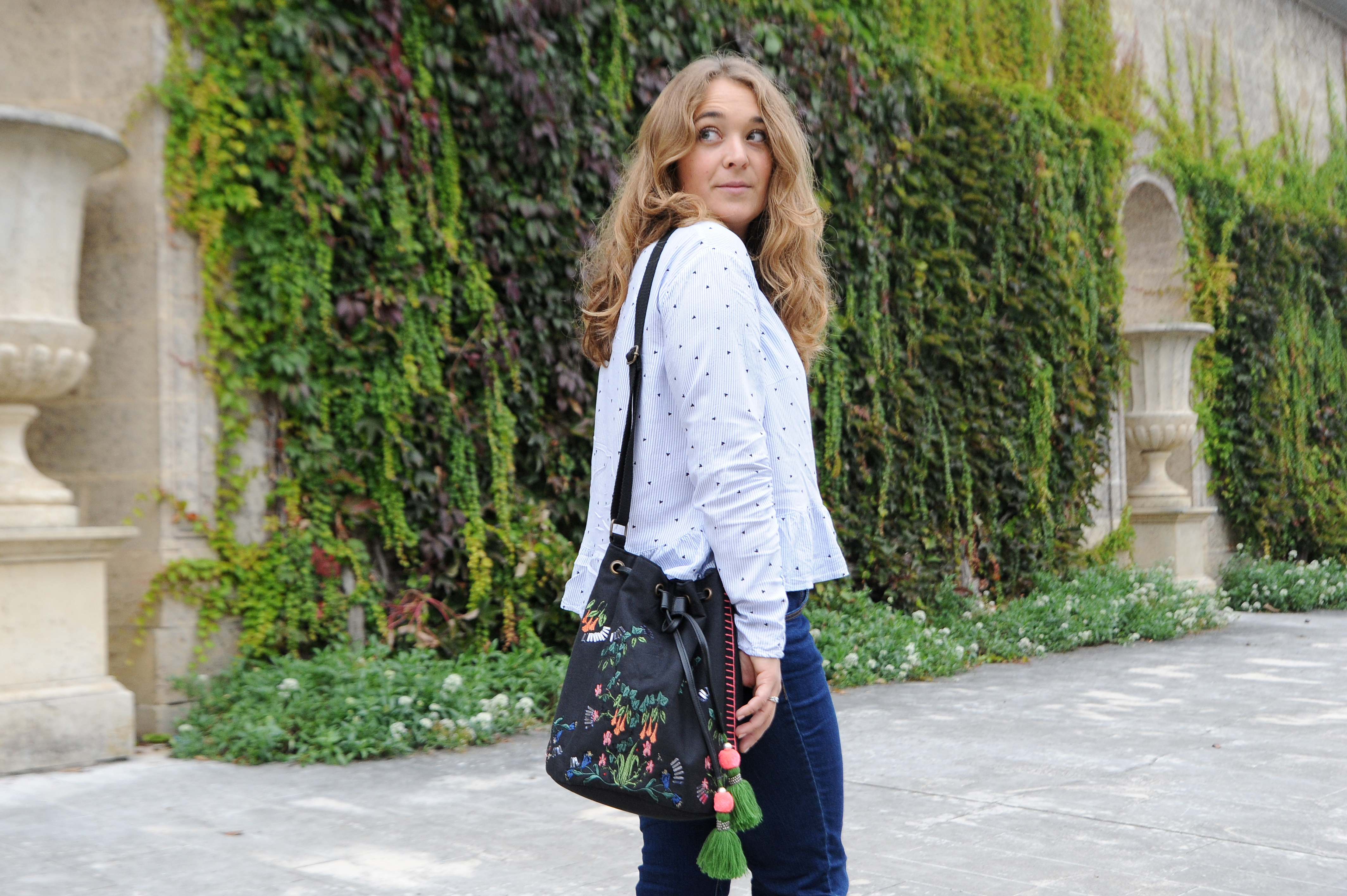 Cela fait un moment que je cherche un sac seau un peu original. J’ai trouvé mon bonheur avec la marque Lollipops et ce sac en denim noir aux broderies multicolores fleuries. J’adore ce style bohème, toutes ces couleurs et ces pompons !