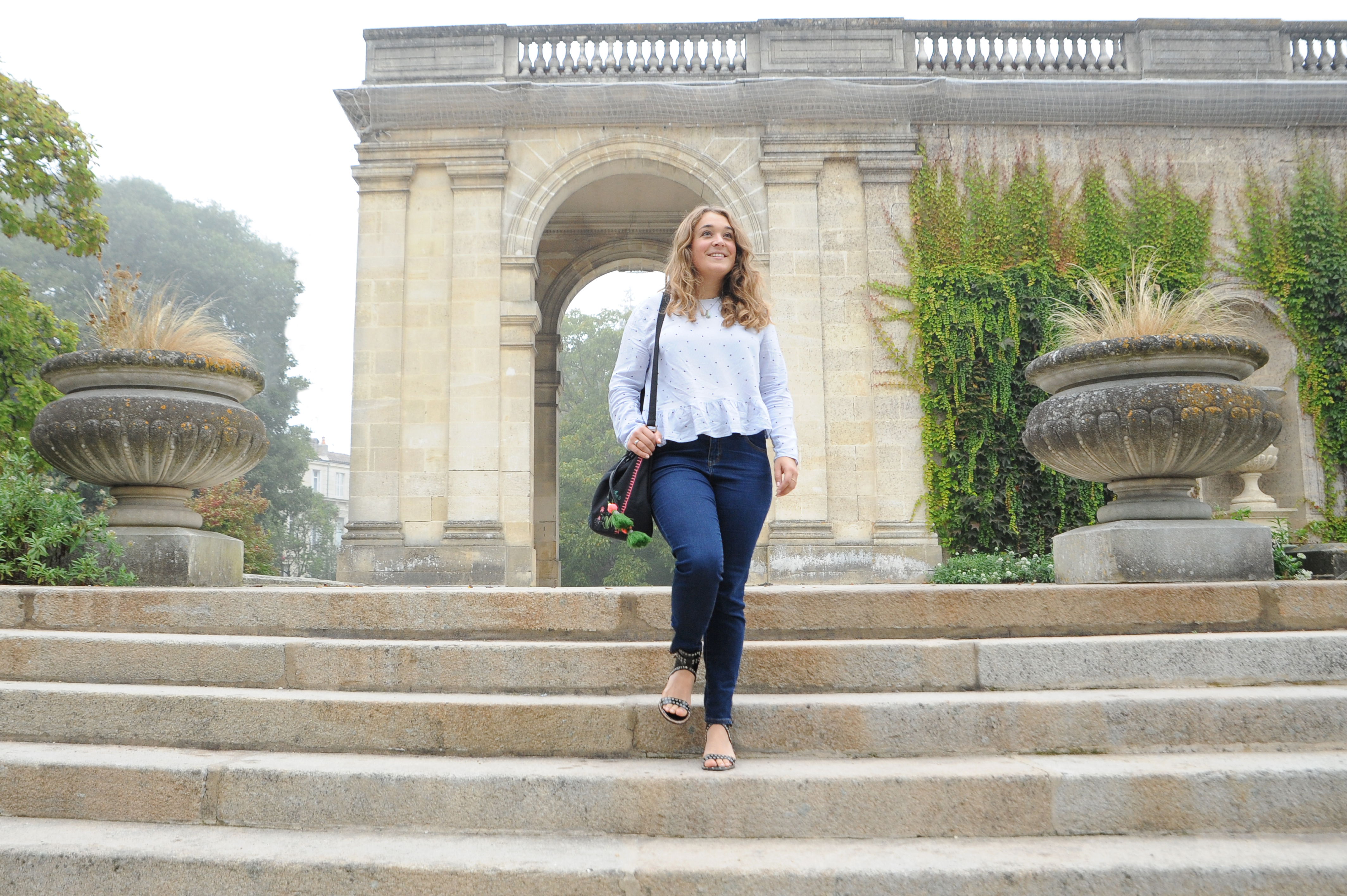 En ce moment ma lubie shopping porte un nom : accessoires ! Et s’ils sont bien choisis, ils n’ont d’accessoires que le nom ! C’est le cas avec cette silhouette toute bleue vraiment valorisée par les couleurs de mes bijoux et de mon sac. La longueur du jean (7/8°) ressort bien grâce aux sandales cloutées et la douceur du top bleu et blanc est pimpée par les pompons flashy et le bracelet fushia. Bref, j’adore ce mix !