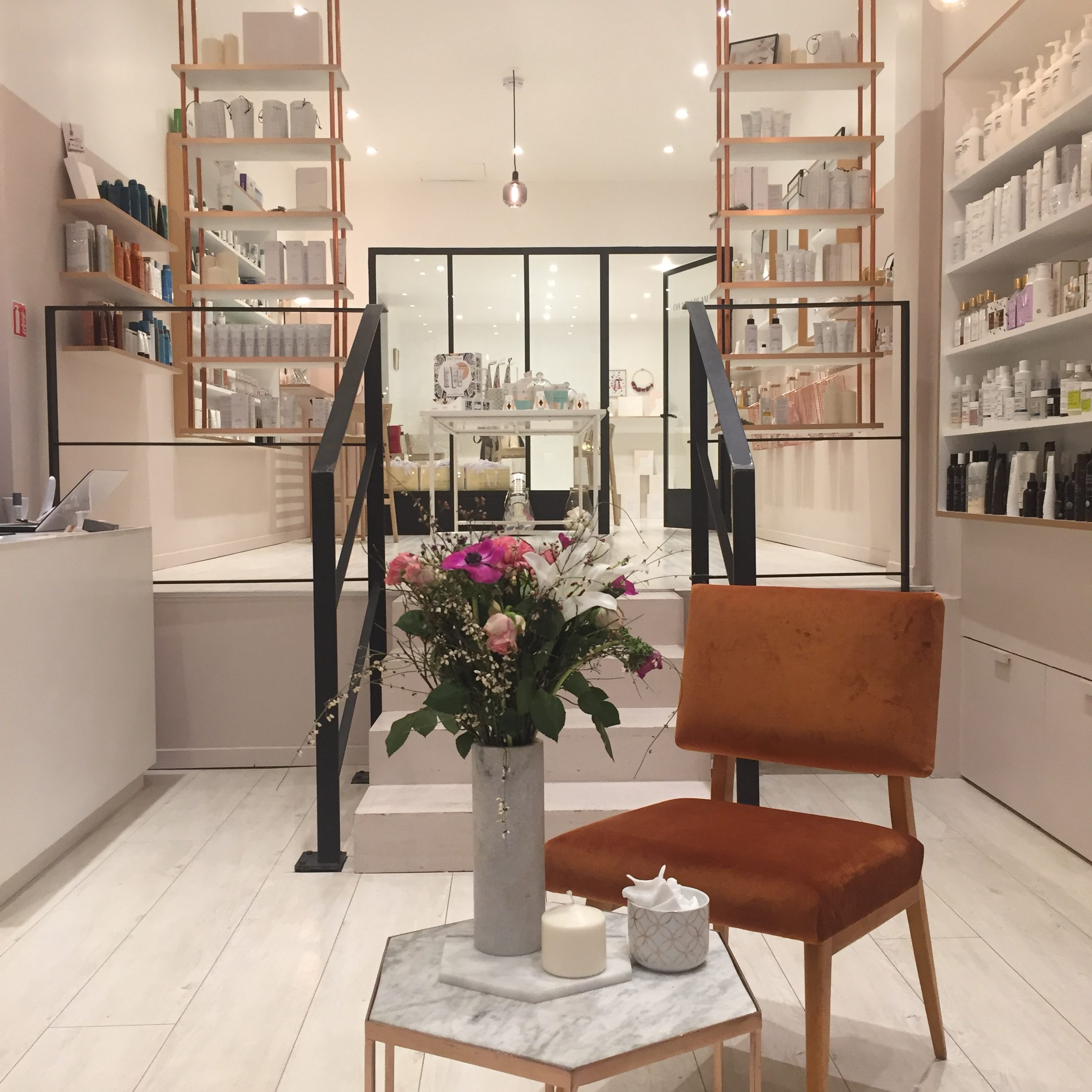 Bon premier point, le lieu est très lumineux. Couleur dominante : le blanc. Cela n’en fait cependant pas un lieu froid, bien au contraire. Déjà car il y a aussi des notes de bois et de métal, des fleurs et fauteuils. Mais aussi car Marine et Lauryne, les deux expertes beauté qui nous attendent sont adorables et chaleureuses ! On sent qu’elles aiment leur métier et leur environnement de travail.