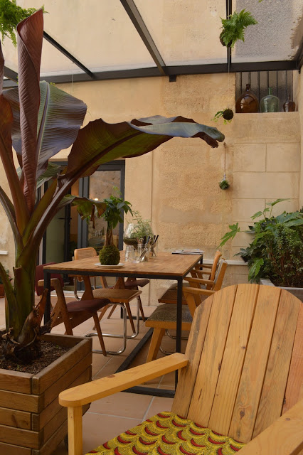 Imaginez un immense puits de jour, des pierres apparentes, des chaises et fauteuils en bois avec coussins aux motifs ethniques et des plantes qui tombent du ciel : un vrai petit coin de paradis !