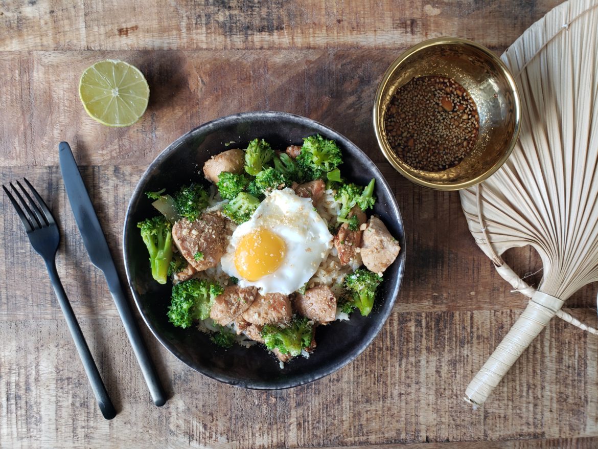Nouvelle recette pour terminer l’année en beauté : celle d’un plat ultra gourmand et nourrissant, le bowl vermicelles de riz, poulet mariné au soja, brocolis et œuf au plat. Une recette facile qui peut être déclinée à l’infini en remplaçant les vermicelles de riz par n’importe quel féculent (de type boulgour, pâtes, riz, semoule, quinoa) et en remplaçant le brocolis par n’importe quel légume qui peut cuire à l’eau ou au four.