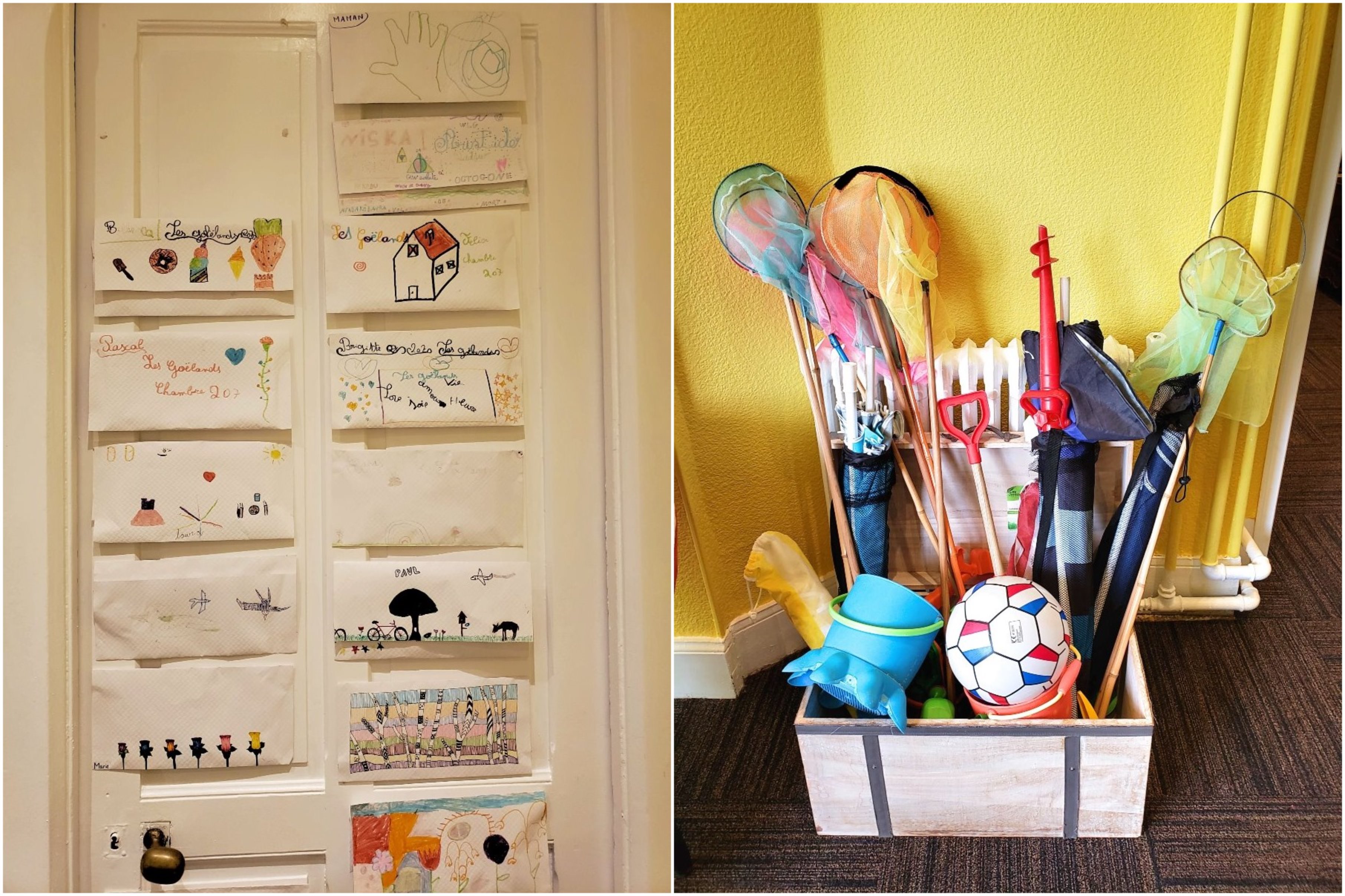 Outre cet engagement j’ai énormément apprécié l’esprit pension de famille des Goélands. Cet hôtel appartenait à la grand-mère de Pampi, l’actuel propriétaire qui a su garder cette ambiance bon enfant, très familiale et décontractée. L’hôtel les Goélands est vraiment un hôtel kids friendly ! Chaises-hautes à disposition, lits parapluies disponibles sur demande, jouets en libre-service (notamment des jouets de plage entreposés à la réception). Pour faire patienter les enfants à table, Cathy et Pampi les invitent à dessiner sur leurs porte-serviettes en papier (qu’ils retrouveront au prochain repas). Le jour de leur départ, leurs œuvres sont affichées dans l’entrée du restaurant. Une attention adorable! Ah et en parlant d’attention…le repas est offert (oui offert!) pour les enfants de moins de 4 ans ! Franchement, si avec ça les enfants ne sont pas les bienvenus ici 😉