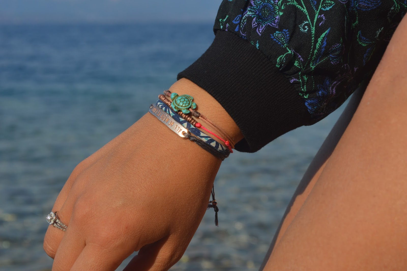 Côté accessoires, tout se passe sur mon poignet droit. Je joue l’accumulation de bracelets (comme tout le monde l’été non?) avec mon éternel bracelet tortue que je ne quitte pas depuis ma lune de miel à Rodrigues, un cordon liberty acheté à La Droguerie de Bordeaux (2€ le mètre) et deux bracelets de la créatrice grecque Ammos by Kitty, achetés à Vassiliki, l’un fushia, l’autre anthracite avec le message ” All we need is love”.