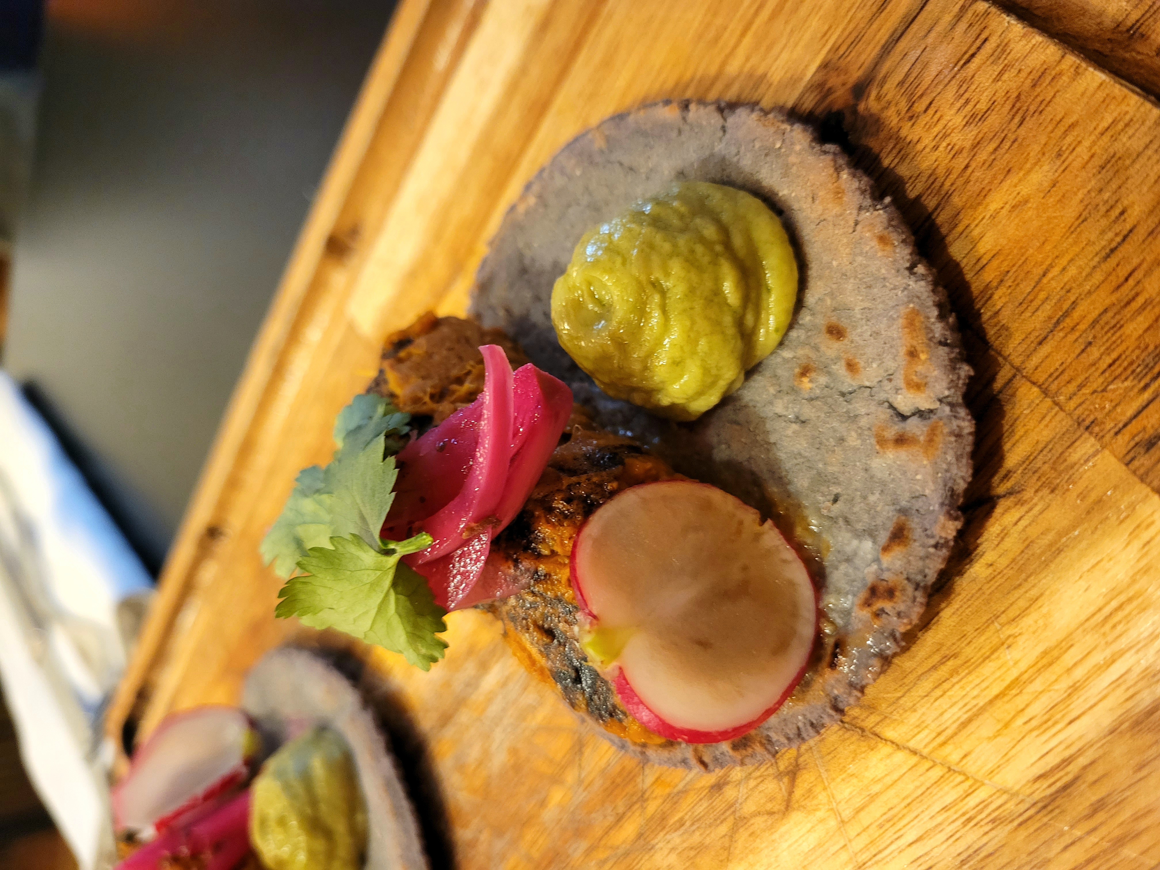- 2 Tacos de cochinita pibil, Crème d’avocat, Salsa macha aux pruneaux