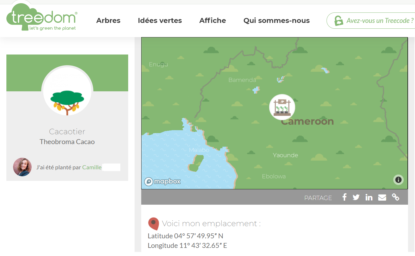 Il y a différentes variétés d’arbres et de régions du monde disponibles sur Treedom : vous pourrez planter un Macadamia au Kenya pour 29,90 €, un cèdre à Haiti pour 26,90 € ou encore un caféier au Guatemala pour 18,90 €. Pour ma part j’ai planté 2 cacaotiers au Cameroun, pour 14,90 € l’un.