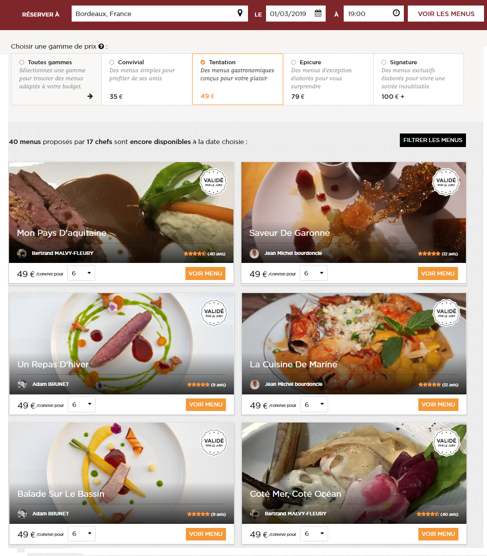 Choisissez votre menu, aidés des avis déposés par les clients, du profil du chef et des photos de ses plats. Réservez et payez en ligne.
