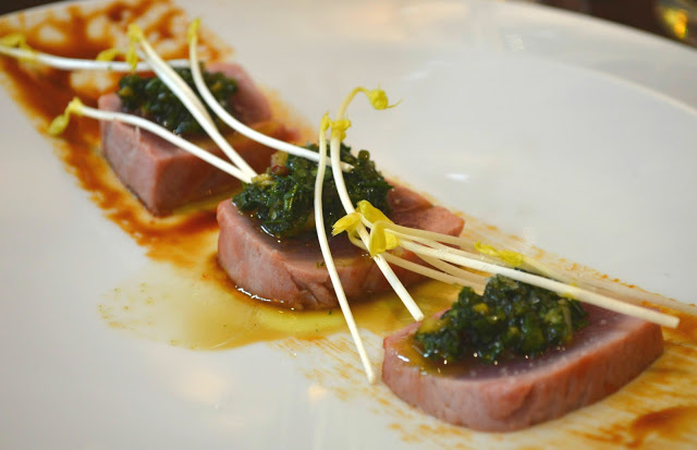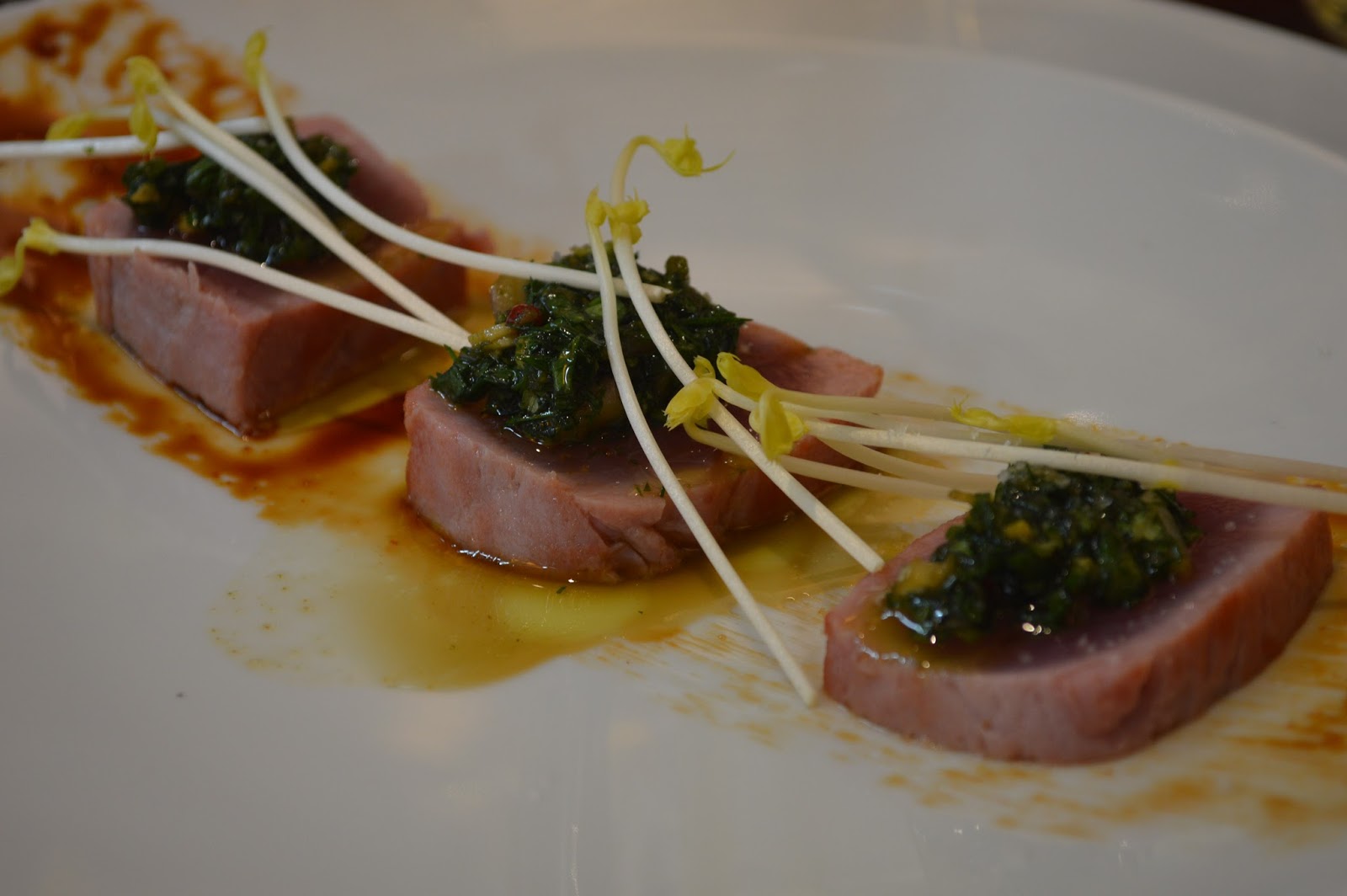 Entrée : Emincé de thon rouge mi-cuit aux herbes.