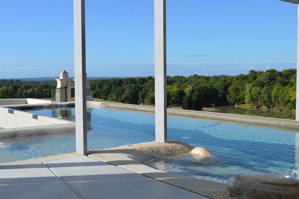 – la piscine chauffée et le jacuzzi avec vue sur les vignes et l’étang en contrebas