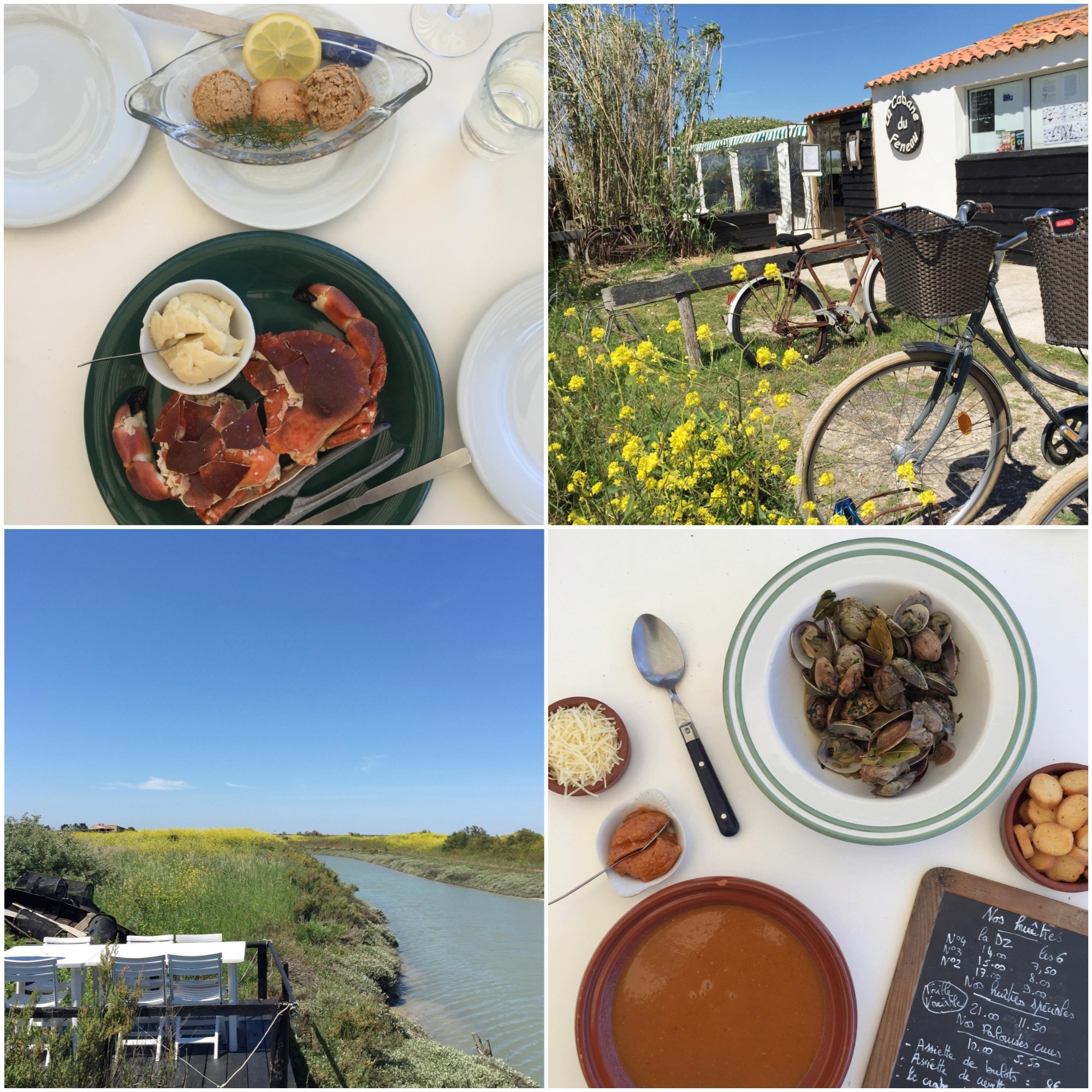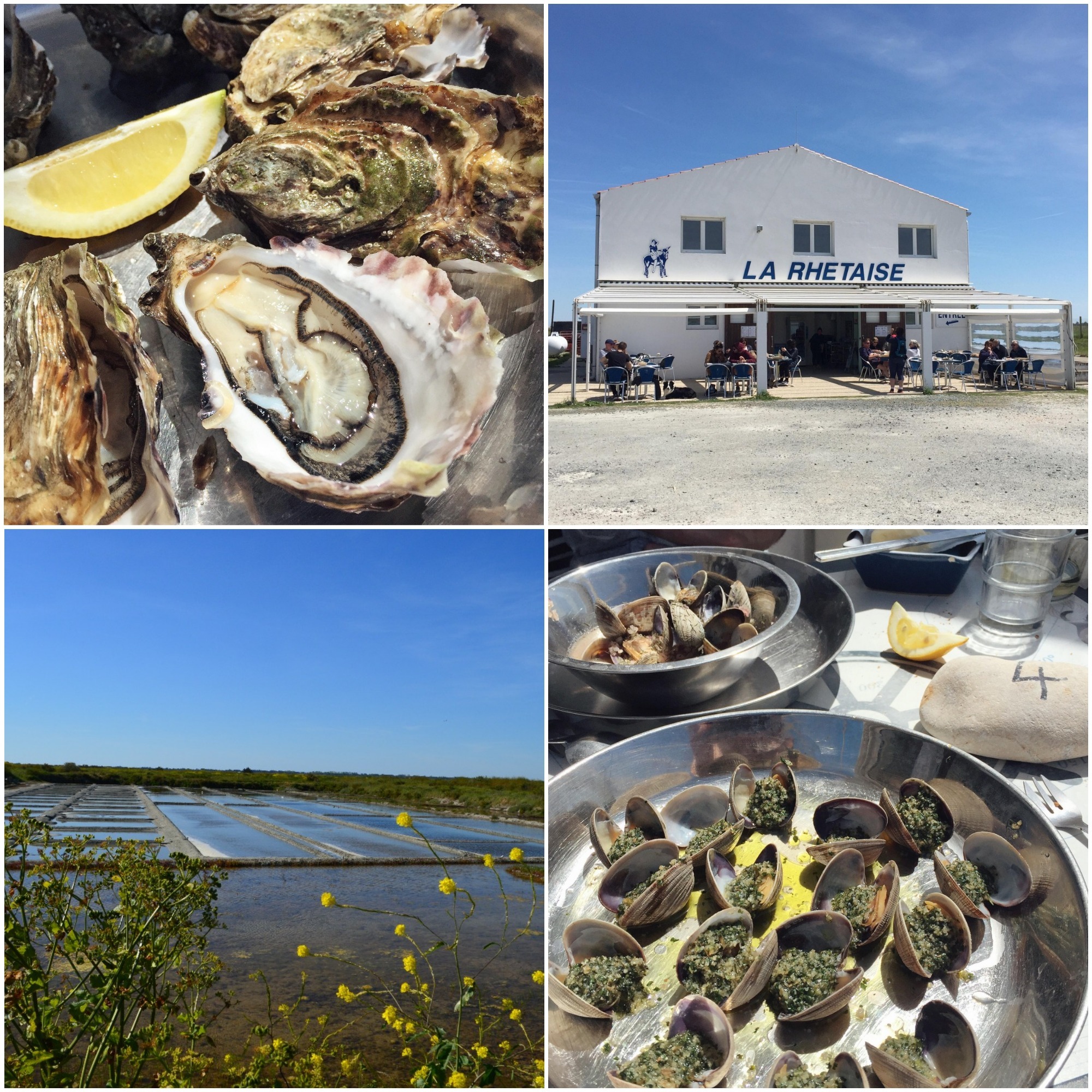 Ici on est au cœur du site de production d’huîtres qui sont servies tous les jours. Une terrasse accolée au site fait office de lieu de dégustation. Bref pour les amateurs d’huîtres, c’est l’adresse rêvée ! C’est simple : les huîtres sont encore dans l’eau quand on passe commande, et sont ouvertes sous nos yeux (précisément juste derrière nous). De première fraîcheur, avec une saveur franchement subtile. Mon mari qui n ‘en mange jamais s’est même laissé tenté… c’est dire. A goûter absolument aussi : les palourdes à la rhétaise, farcies avec un hachis maison d’herbes et d’échalotes).
