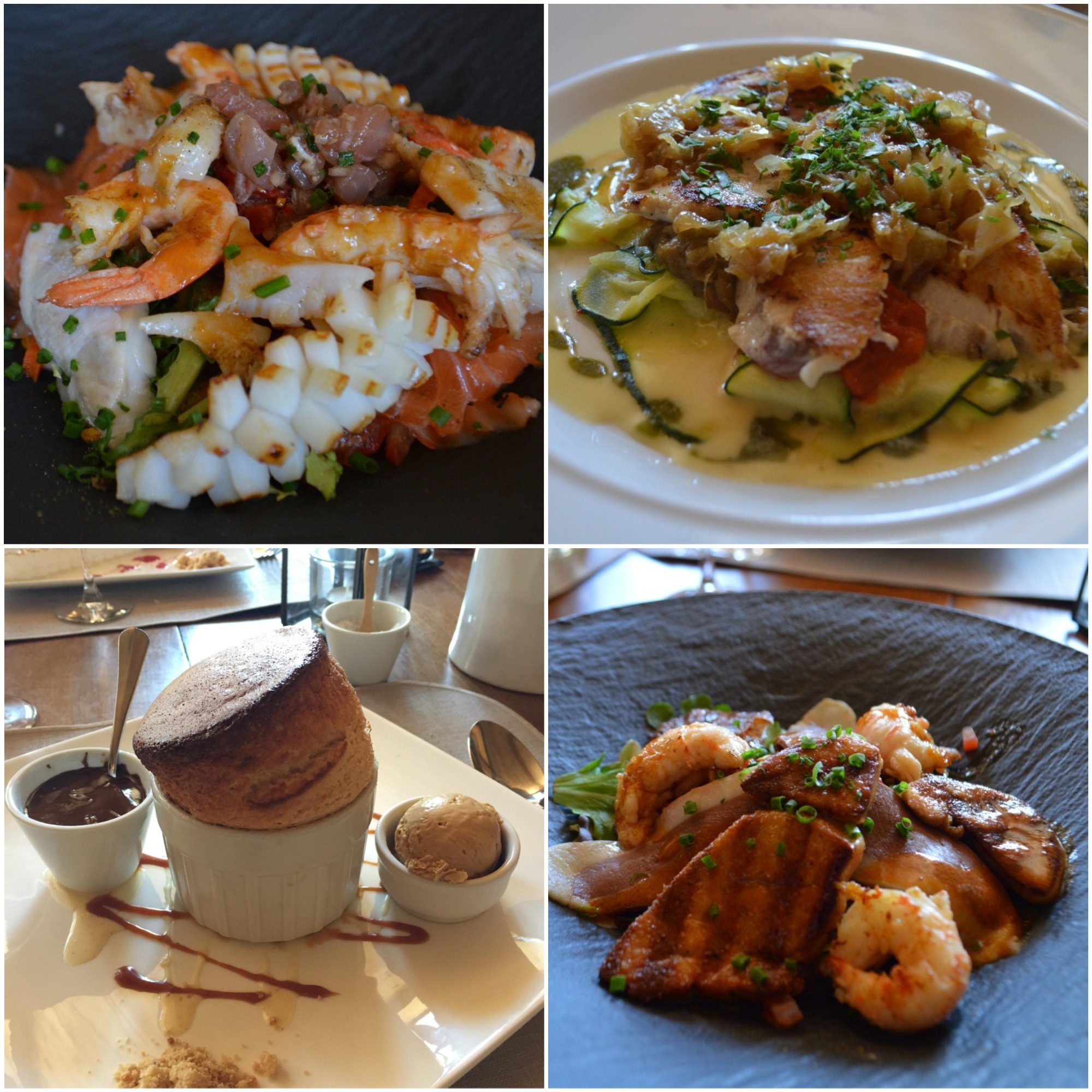 Entre la carte et les différents menus, vous aurez pas mal de lecture ! Mais pour ma part je vous conseille le menu découverte à 42 € ou le menu des pêcheurs à 62 € (tous deux disponibles uniquement le midi). C’est ce que nous avons pris avec mon mari et ces menus permettent de se régaler pour une addition un peu moins salée (iodée devrais-je dire) qu’à la carte ! En entrée j’ai aaadoré la salade de foie gras de canard poêlé et queues de langoustines rôties, parfumée au magret de canard fumé. Et la salade gourmande de l’océan (poissons fumés et marinés, seiche grillée, crevettes, langoustines) dégustée par mon mari était aussi dingue ! En plat, poissons obligatoires !!! Maigre, Saint-Pierre, Barbue, Rouget, tout est frais et tendre à souhait. Enfin en dessert, foncez pour le soufflé au caramel et à la fleur de sel, servi avec un pot de chocolat noir fondu… mon dieu !