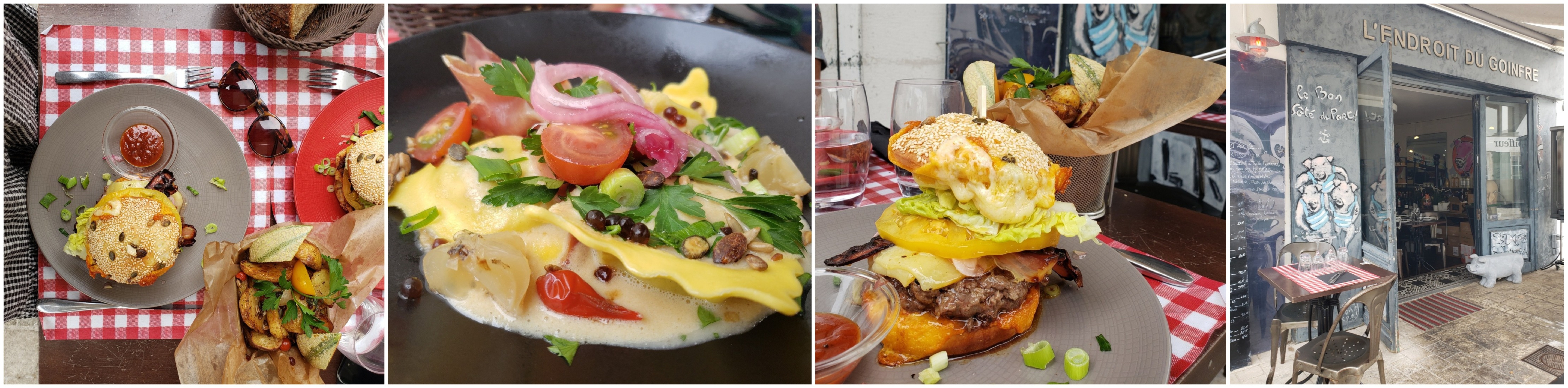Autre restaurant, bistrot cette fois-ci : l’Endroit du Goinfre. Une carte alléchante d’assiettes type fricassée de palourdes (12 €), ravioles crème parmesan serrano (12 €) travers de porc au caramel fleur de sel (20 €) ou encore côte première de veau aux girolles (35 €). Et puis surtout…des burgers ! D’excellents burgers ! Avec des ingrédients de qualité : super ventrêche, cheddar délicieux, et je vous parle pas du steack haché divin. Le burger est servi avec de succulentes pommes de terres de l’île de Ré. Bref, un plat à 20 €, ce qui pourrait paraître cher pour un burger mais ça les vaut largement. Service très cool et jolie terrasse à deux pas du port. On valide !