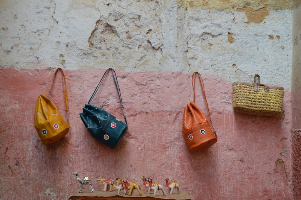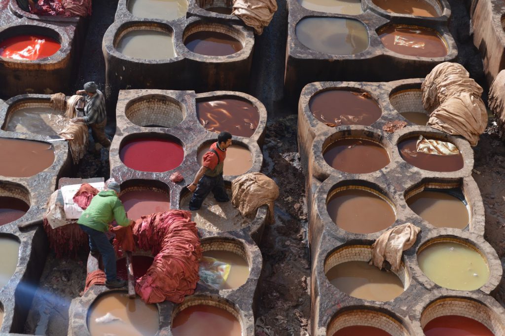 La visite des tanneries si emblématiques de la ville est un passage obligé à Fès. La menthe distribuée à l’entrée permet de masquer l’odeur très forte des peaux lavées à la chaux en contre-bas. Le spectacle est impressionnant, hypnotisant. Et tel un avant/après, nous sommes invités ensuite à découvrir les créations en cuir issu de la tannerie : sacs, blousons, poufs et chaussures de toutes les couleurs et surtout d’une belle qualité.