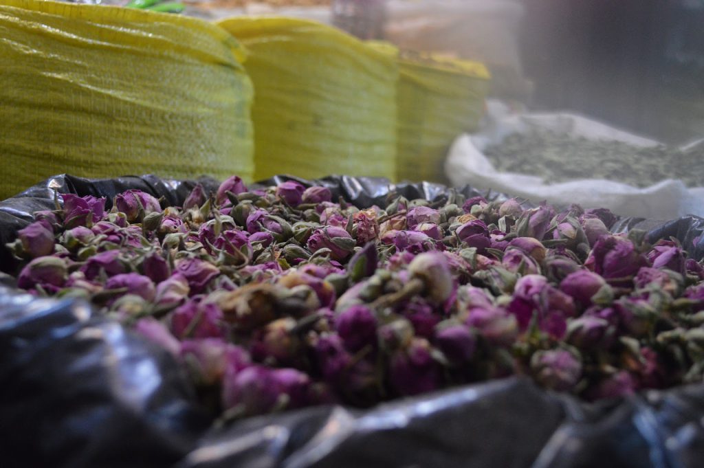 En immersion dans la médina, les étals des marchands se succèdent et ne se ressemblent pas: olives, fruits, roses séchées,