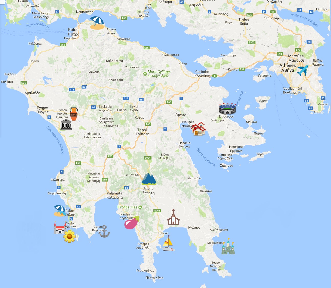 Notre road trip constitue une boucle comme indiqué sur la carte avec les arrêts suivants : Athènes – Ziria – Olympie – Pylos – Methoni – Koroni – Kardamyli – Gythio – Monemvassia – Mystras – Nauplie – Epidaure – Athènes.