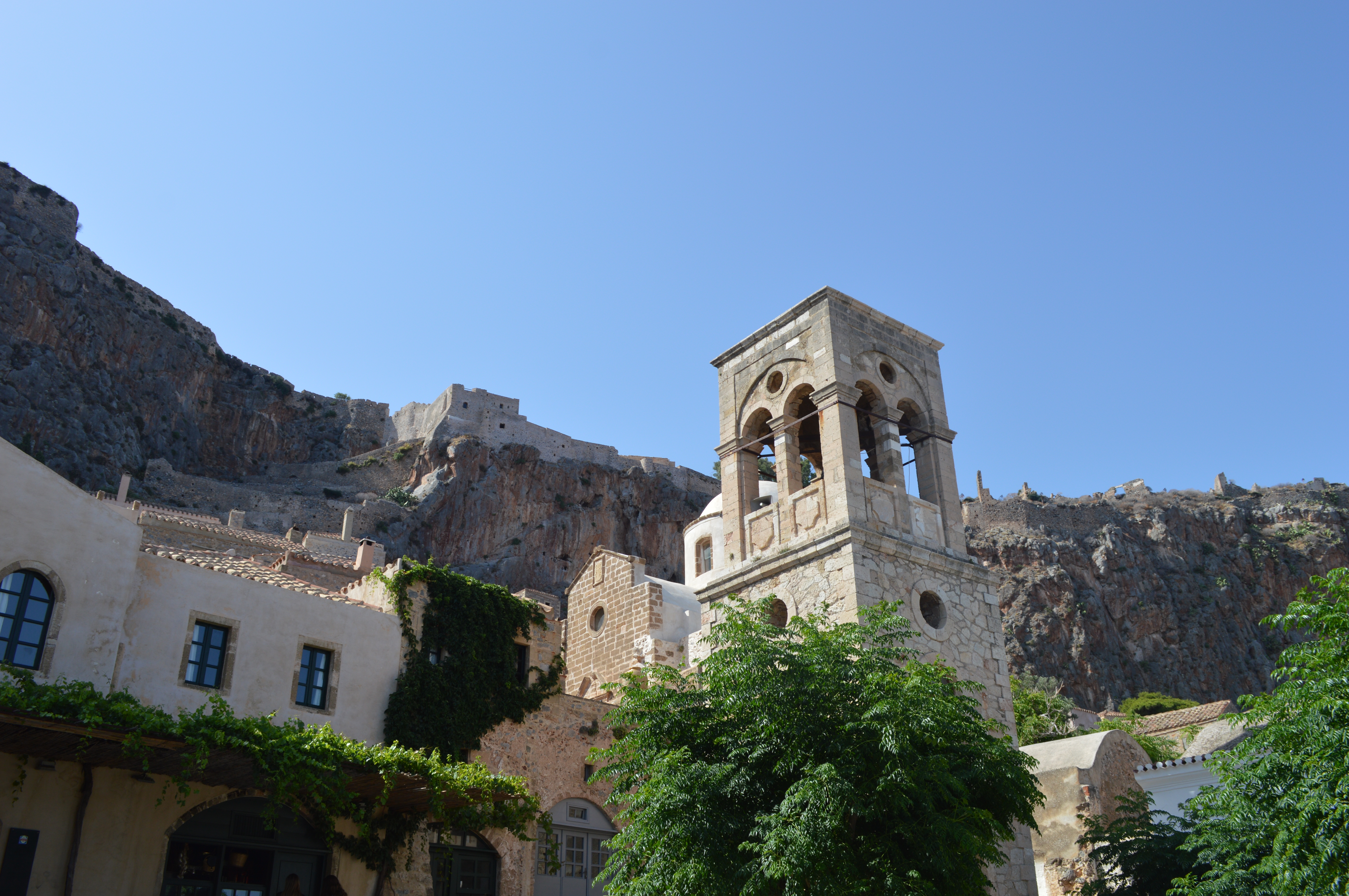 A la pointe Sud Est du Péloponnèse Monemvassia est une ville fortifiée bâtie sur un immense rocher relié au continent par une petite route. Tout commence dans la ville basse, entre petits commerces, bistrots et églises byzantines. On monte ensuite vers la partie haute pour découvrir l’église Aghia Sophia suspendue au dessus de la mer et une vue panoramique sur les centaine de maisons de la “ville-château” et la mer.