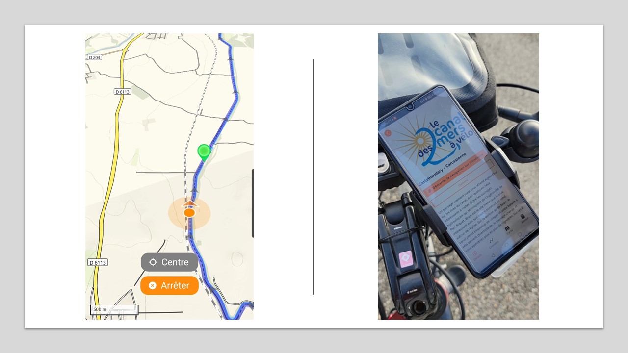 Attention notez que l’application mobile ne fonctionne uniquement lorsqu’on est sur l’itinéraire. L’application vous donnera uniquement les signaux et la direction à prendre lorsque vous serez sur la route bleue (lorsque vous vous éloignez d’environ 50 mètres de la ligne d’itinéraire, une alarme/notification se déclenche pour vous avertir). Si votre lieu d’arrivée / hôtel est en dehors de l’itinéraire il faudra ouvrir un autre navigateur pour se repérer (type Google Maps).